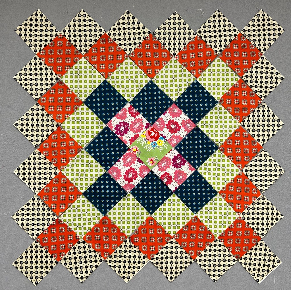 I cut out these 3 1/2” squares some time ago. They are all from my stash of Denise Schmidt fabrics.