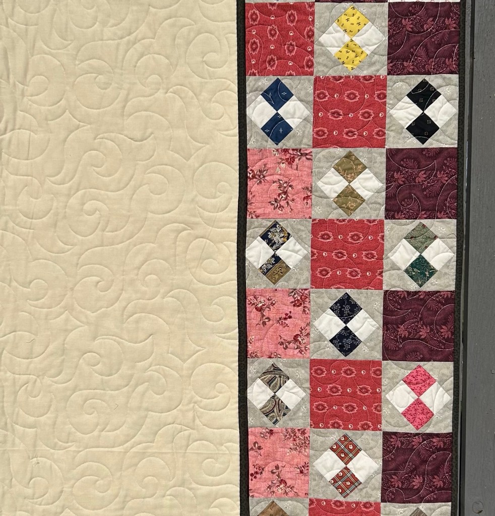 No wonder you are pleased with this quilt Katy! It is lovely! Your placing of the plain squares gives a ‘radiating’ effect that gives the quilt lots of depth and interest. I’m sure it looks great on a bed or over the back of a sofa.