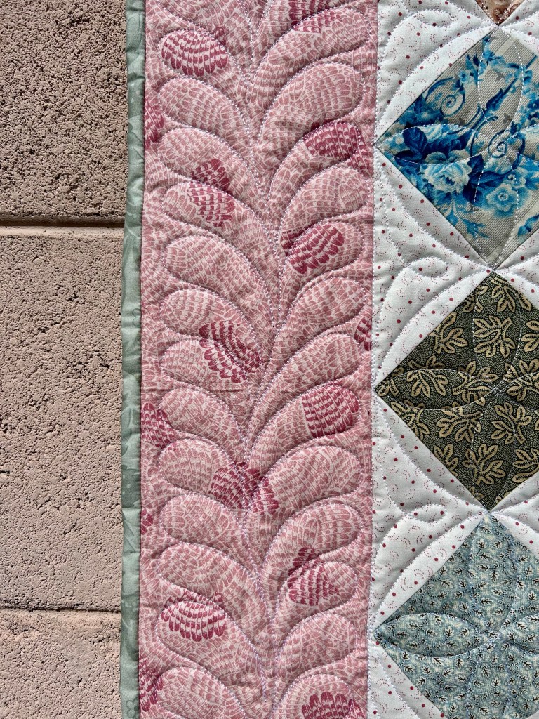 The 1230 is a workhorse. Hope you can get it figured out. Love that pink; it’s perfect for those blocks. Quilting is beautiful.