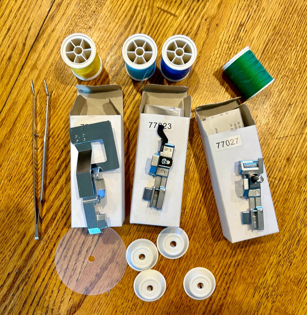 It comes with everything you see below, as well as a dozen bobbins. The knee lifter is for the presser foot. The walking foot is not included. It is in Arizona. 🙄