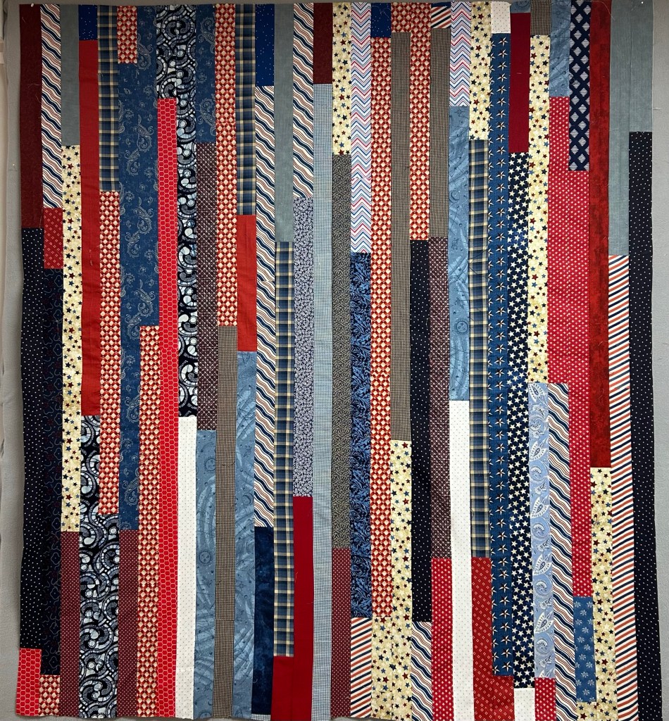 It measures about 64 by 72 inches. I’ll square it all up after quilting. Which will have to wait until we get back to Arizona.
