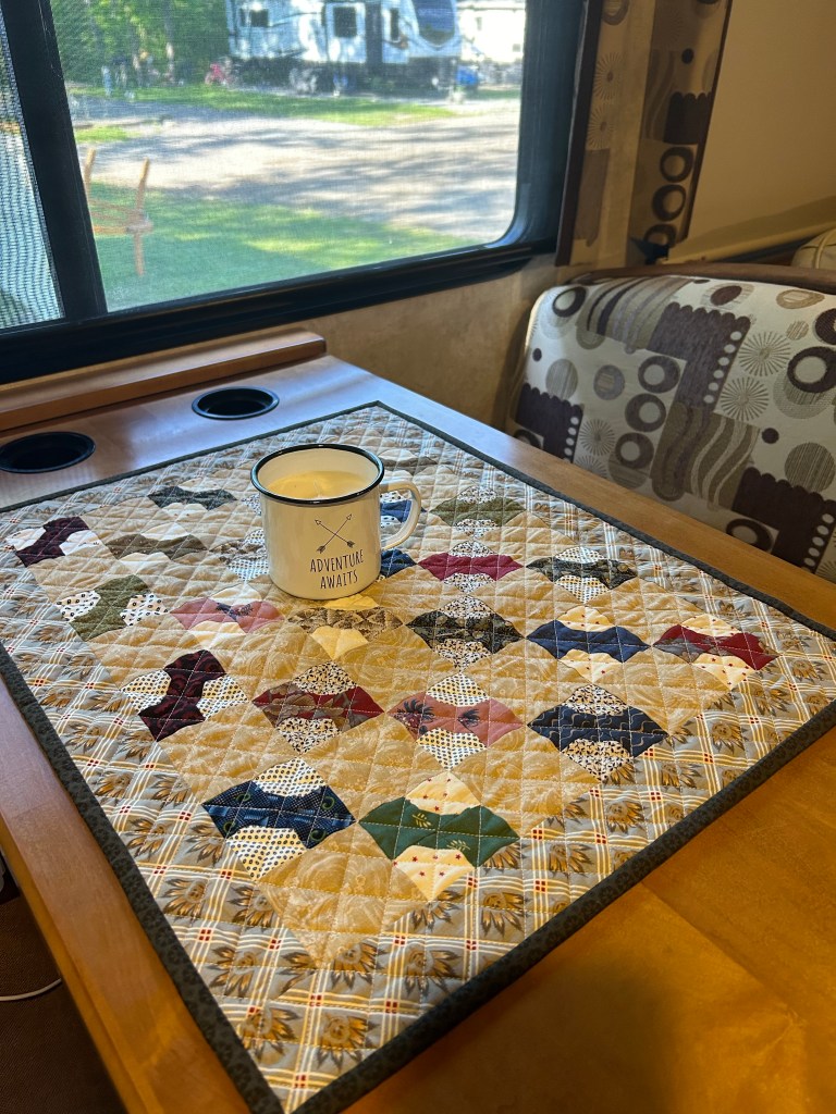 It is rather funny – I just finished a quilt top yesterday and I was hating it while working on it. I was sick of looking at it. I’m sure I will be more sick of it when I start quilting it. Your quilt is lovely! Just right for your RV table.