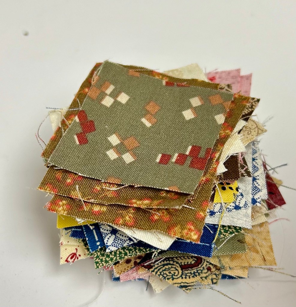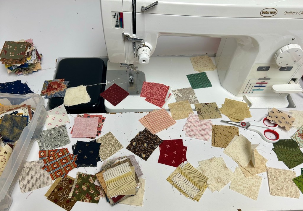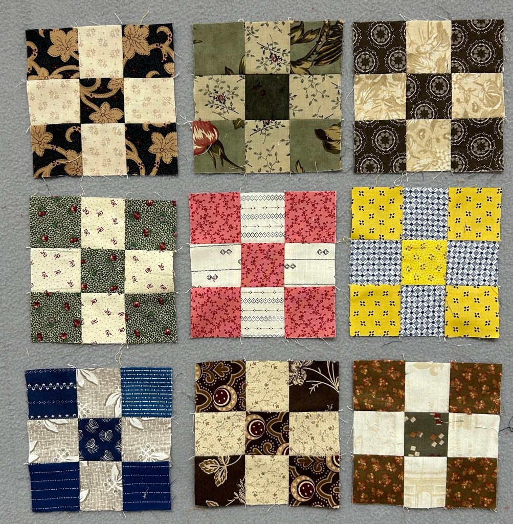 I’m making nine patches. I’m sure I can figure out a way to use these some day. They will finish at four and a half inches.