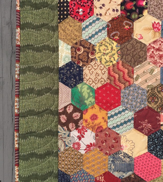 I kept the quilting pretty simple, just freehand continuous curves in the hexies, and a Gothic arch border.