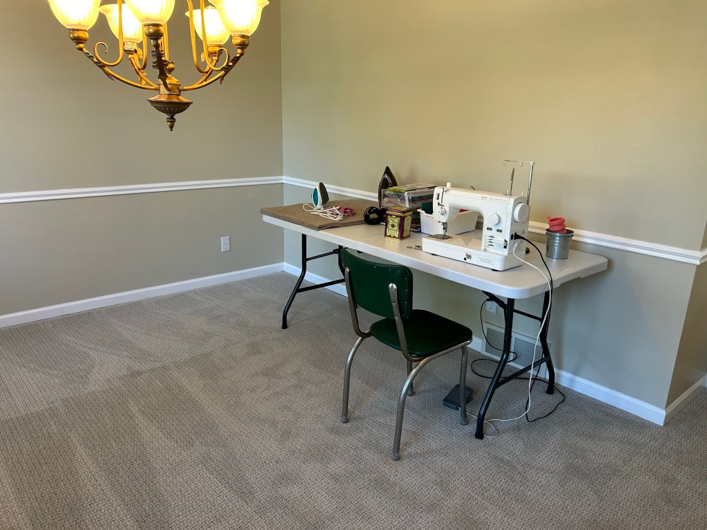 We have sold most of our furniture, including my sewing desk. So now I have a folding table in the dining room.