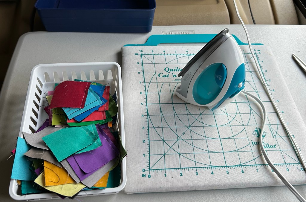 Here is my pressing set up in Dora. When I need to press, I move my sewing machine to the dash and put this pressing surface on my table.