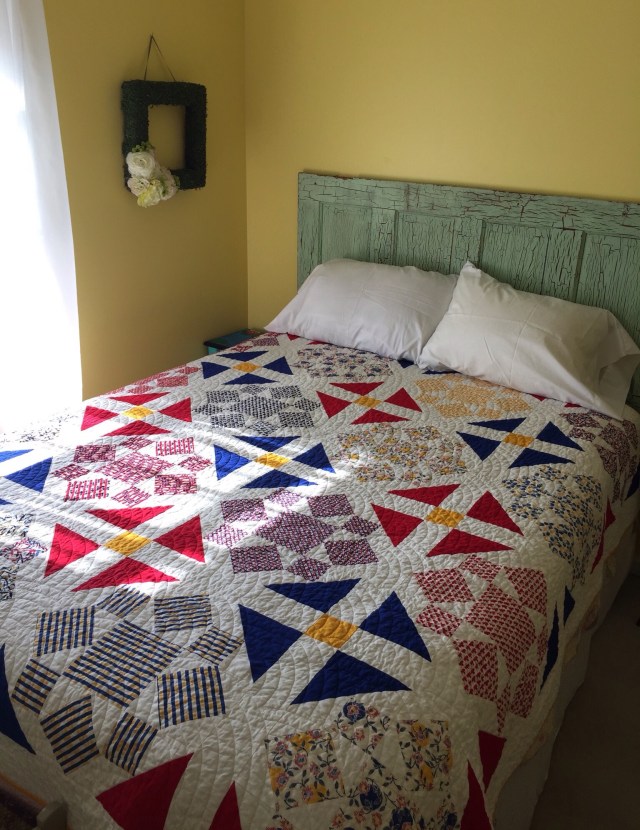 I used Superior Mono-poly thread on top and white magna Glide Classic in the bobbin. It is currently living in my guest room.