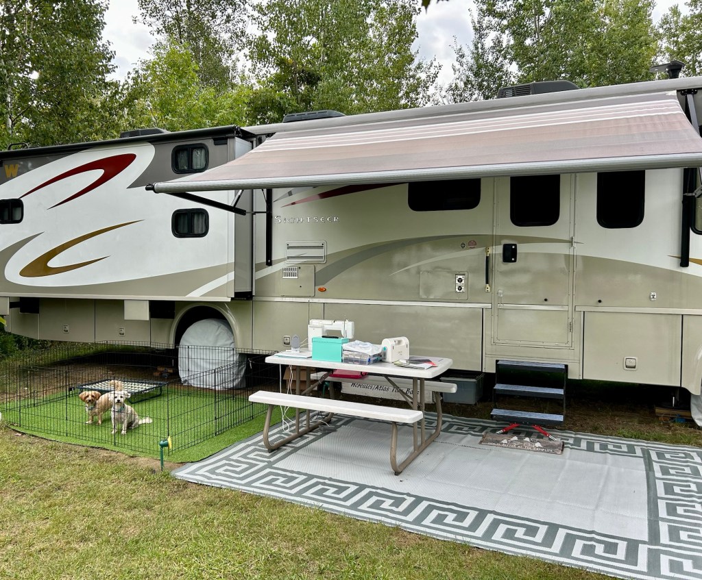 I have a camper, also. I purposely bought an inexpensive (and very lightweight) sewing machine to remain on my camper. I have not sewn outside, though. Will have to try it when I have extra time. Your camper looks quite cozy and I’m sure it is much more fun to sew log cabin blocks in the fresh air. A lovely stack of blocks!