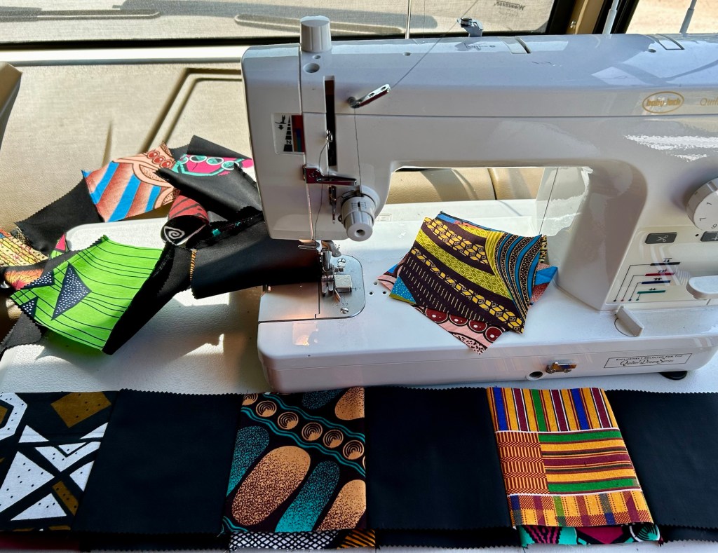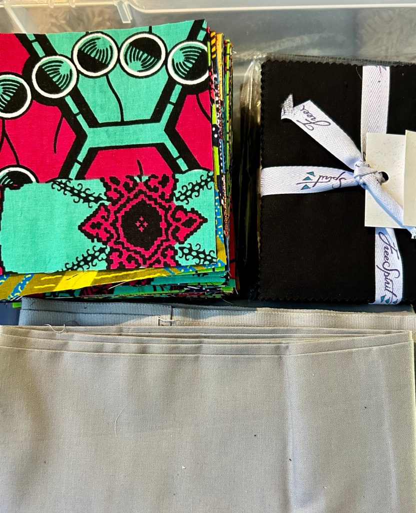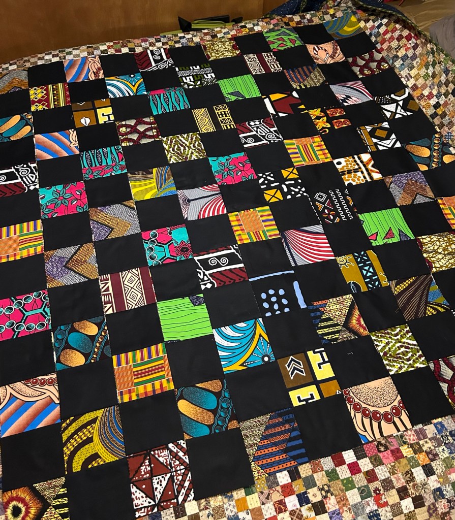 I cut up a bunch of charms out of my African fabric stash last spring. I had a couple charm packs of solid black to pair with them.