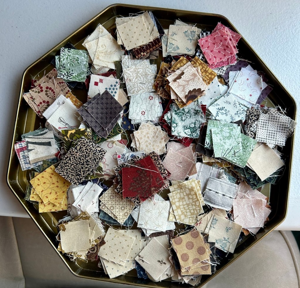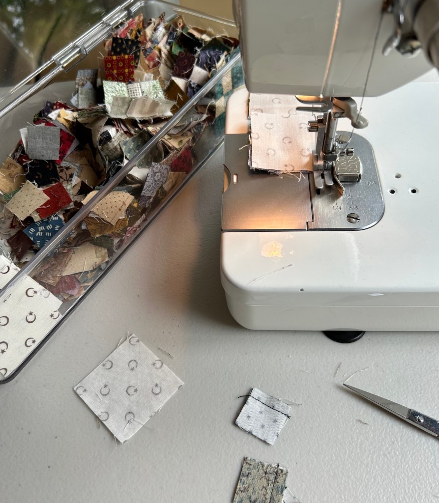 This may look like a jumbled mess, but it’s the next 50 or so little 9 patches all sorted and ready to sew.