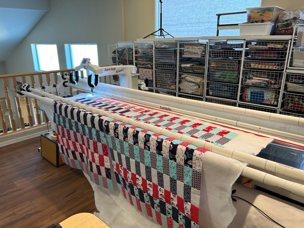 I’m so happy to be quilting again! I pieced these small tops at the campground and I decided to load and quilt them at the same time.