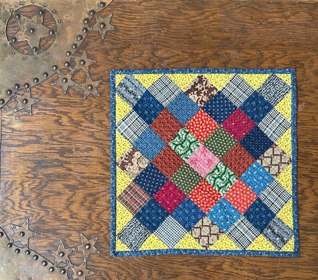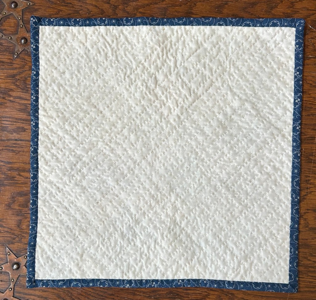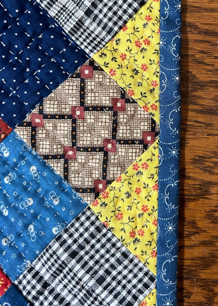 I finished the hand quilting on this little doll quilt on our way home, but then it sat around for a while waiting for the binding.