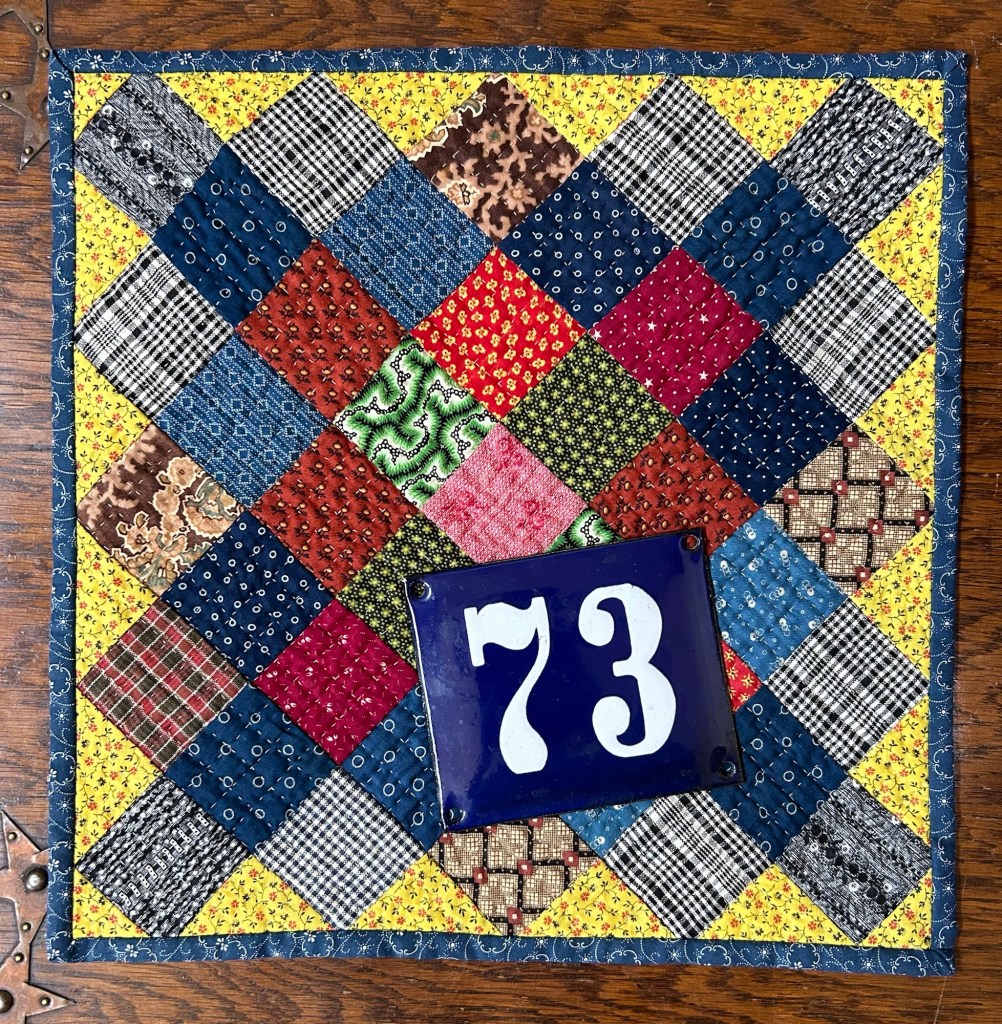 The enamel number plate was purchased in Iceland at a flea market. Seventy-three was our house number when we lived in France years ago. We had an address plate like this back then. It seemed to match the quilt.