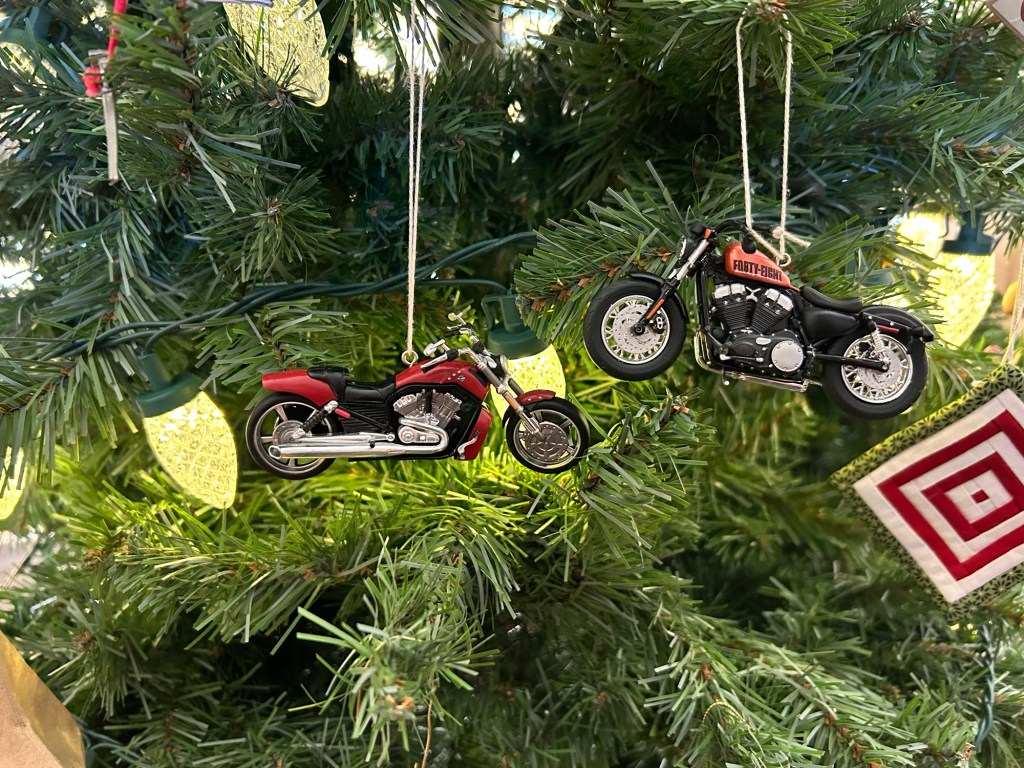 Mr. Wonderful surprised me with these new tree ornaments! The one on the left is a Harley VRod like his. The one on the right is a Harley 48 just like mine.