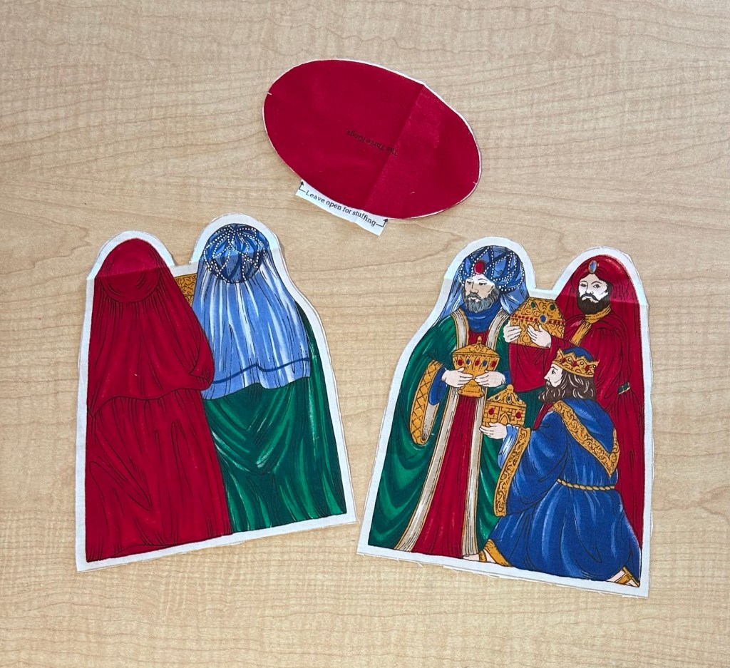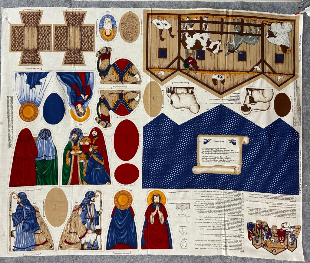 Your finish brought back memories from 31 years ago. My dear MIL gifted us a rustic wooden Nativity set with pieces between 8 and 10 inches tall made out of 2X4 when our son was a year old. “He can’t destroy it” was her reasoning. Sonny Boy loved the Nativity set and carried around pieces of it for a day or two until we caught him banging the pieces against the windows and TV and throwing them. I happened to be in JoAnn’s and found the same fabric Nativity you just finished, bought it and finished it in just a few days. I did not put any weight in the bottoms and they sat up pretty well and never broke anything when thrown or banged. We used it for years and I passed it down to Big Sister when her little boy was a year old. We refer to the wooden set as the “Lethal Weapon Nativity” and it came into use when Sonny Boy was much older. And just to add more fun, it even has a piece of wire coat hanger with sharp ends bent into the shape of a shepherd’s crook.