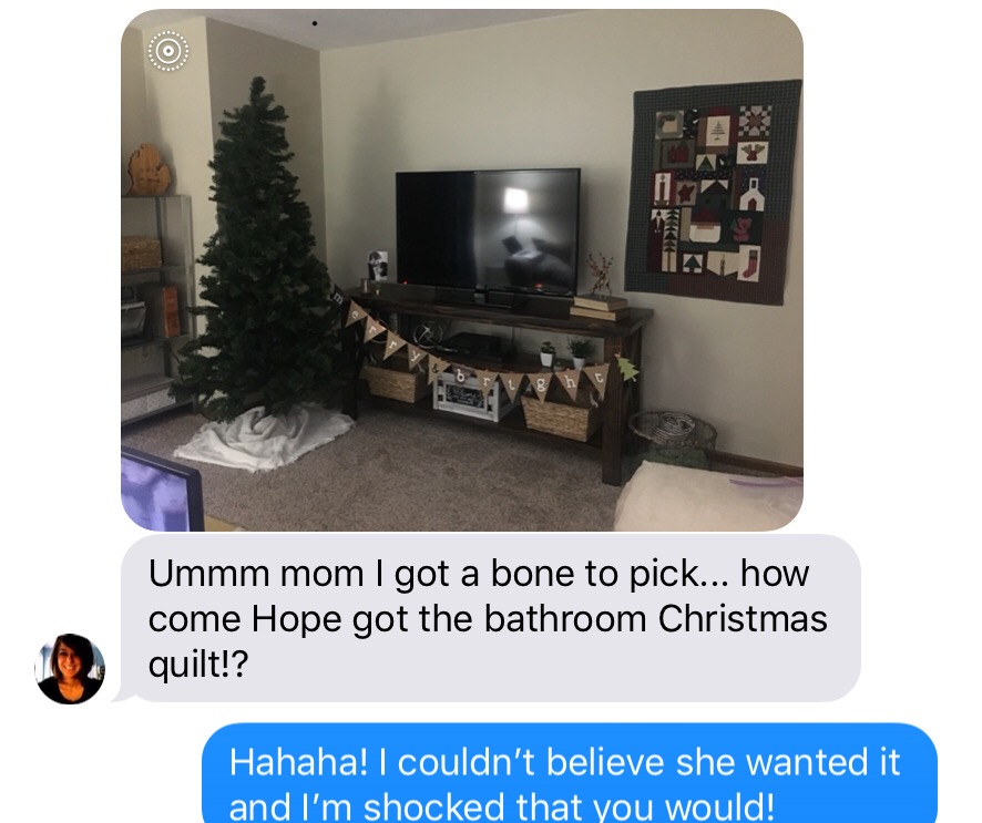 Long time readers may remember this sorry quilt. If you want the back story, you can find it here. It’s a sad looking quilt and hung in my bathroom every Christmas for many years. Last year, I gave it to Daughter #3 when she told me how much she loved it.