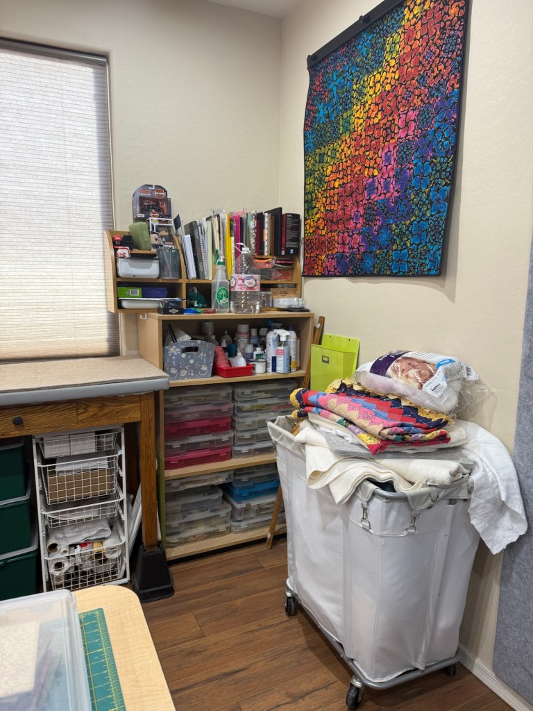 This was the corner of shame, but it is now much improved! The laundry bin on wheels holds mostly scrap batting pieces, fiberfill, and a couple quilt tops that need to be moved elsewhere.