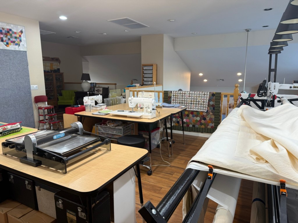If you turn around, you see the main sewing area. The door on the far right leads to a bathroom.