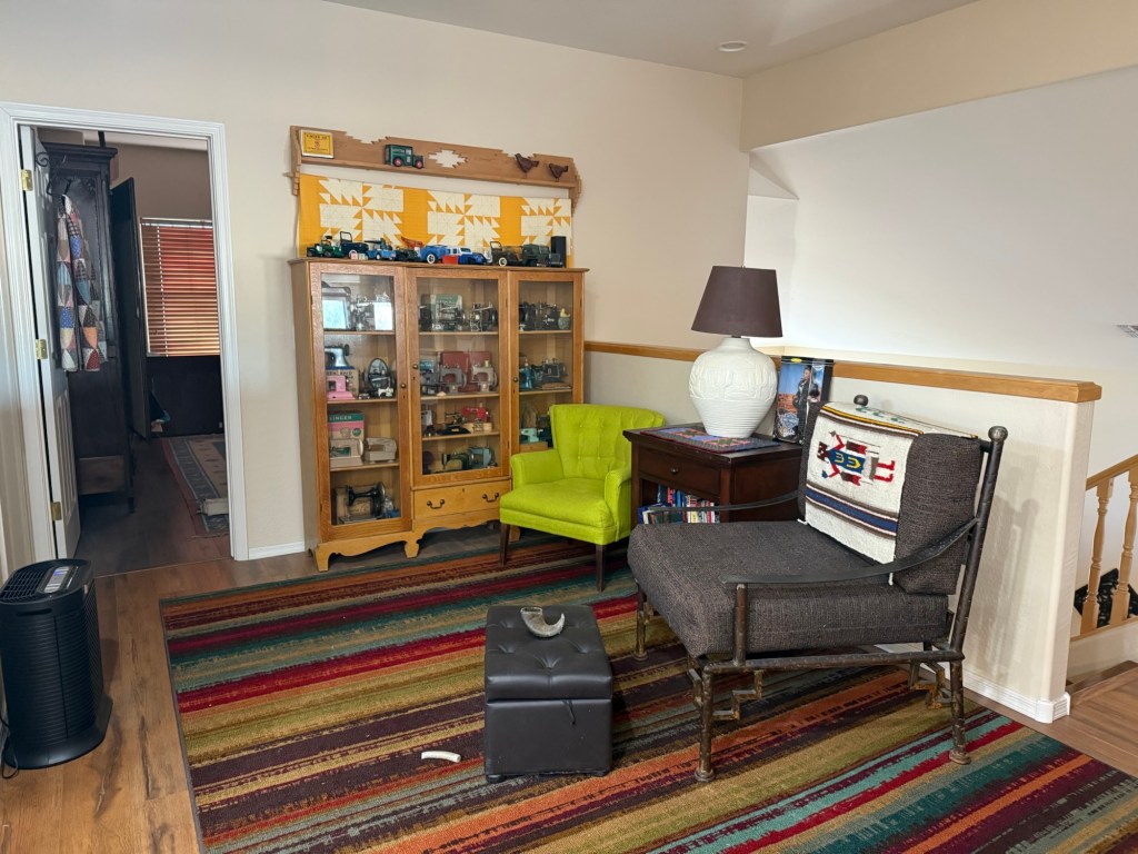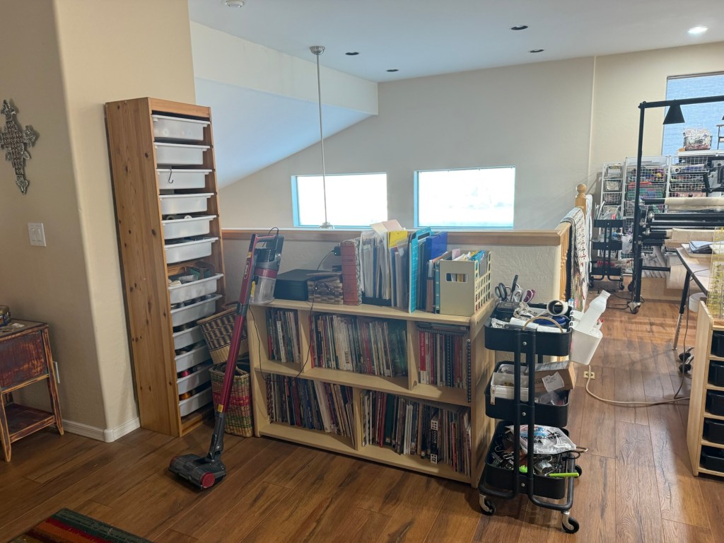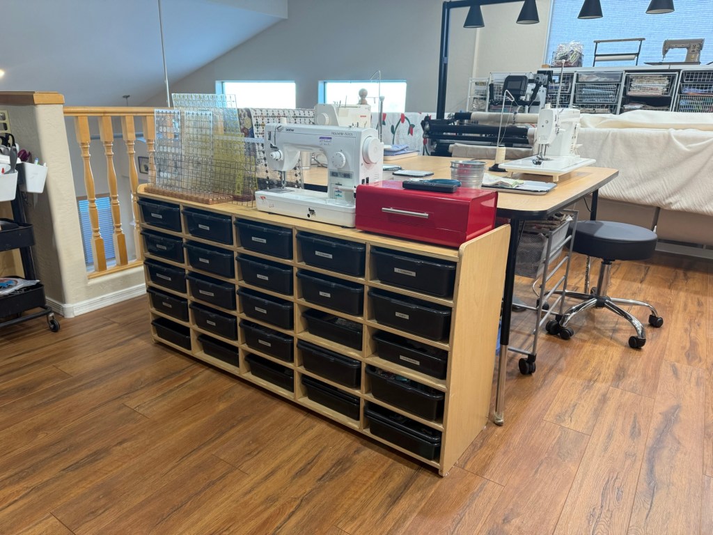Can you believe I’m STILL sorting and finding homes for everything in the sewing room! Combining two large spaces is not for the faint of heart. There are many things I still cannot find. But I spent a whole day last week working on it, so I decided to share. This is the sitting area at the top of the stairs. Ignore the dog bones.