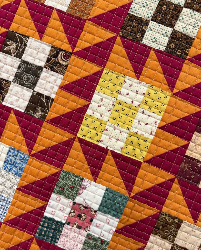 I love this quilt! For some reason I am not able to comment directly on Word Press so I am sending this direct to you. You mentioned that you find doing the grid on the longarm difficult. I think you have a Gammill now. Doesn’t it feature channel lock? If so I think it can be used vertically or horizontally. If so you could just lock in first one, do the quilt, then roll back to top and lock in the other and do it. I have a Gammill, but due to various back and knee problems have not used it for a number of years. But I remember this was a feature I loved.