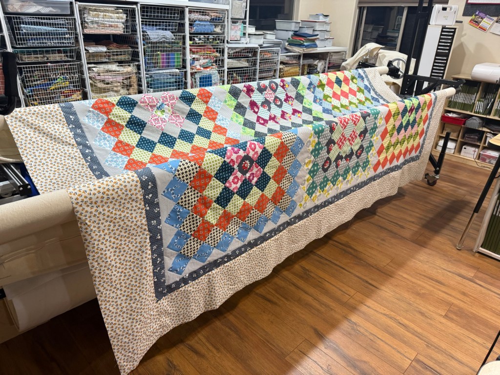 Yay for getting the borders done! It’s like a wrestling match, keeping the quilt from pulling, always having to adjust as you sew. It is huge…at least it appears so (unless you have a very short long arm 😉