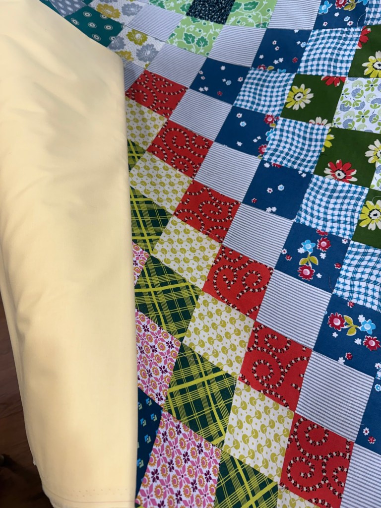 I also figured out a backing. I picked up this solid yellow. Sadly, I have to piece three lengths to get a piece big enough. Wish me luck.