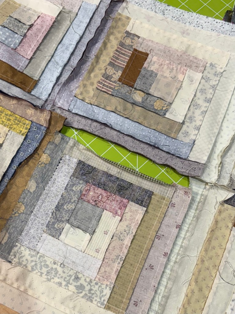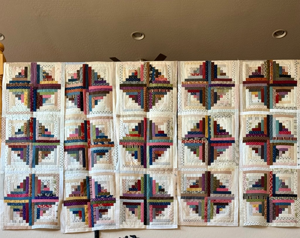 The Log Cabin blocks are beautiful all set together. And I didn’t even notice the two purple strips side by side from a distance.