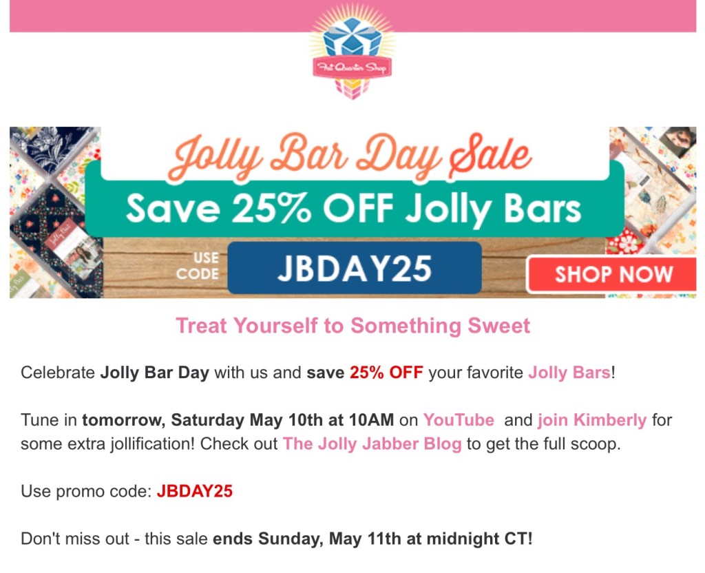 Did you know it is JollyBarDay at Fat Quarter Shop ?