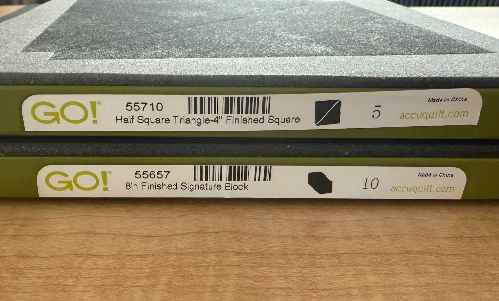 I confess, I got this idea from Wanda at Exuberant Color. She just got the big AccuQuilt Signature die and mentioned it was a good fit for a layer cake. These two dies, shown below, are from the 16” Qube.