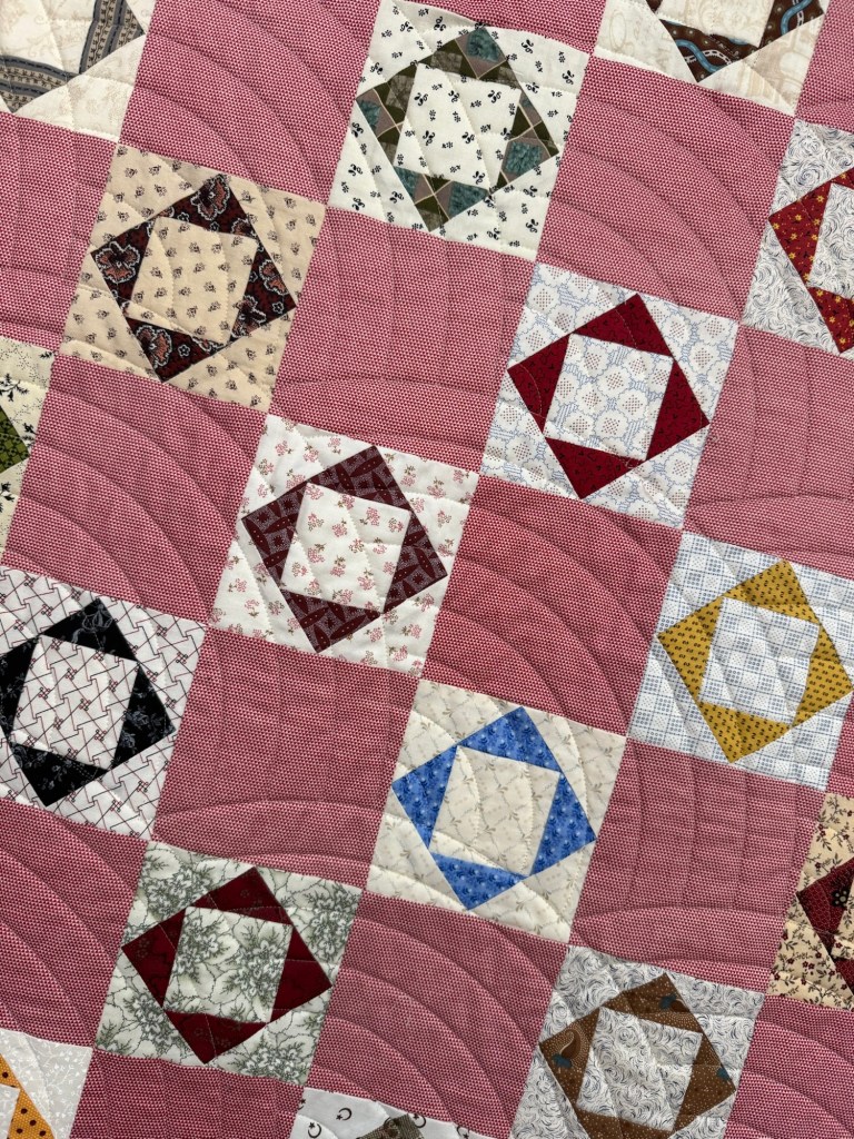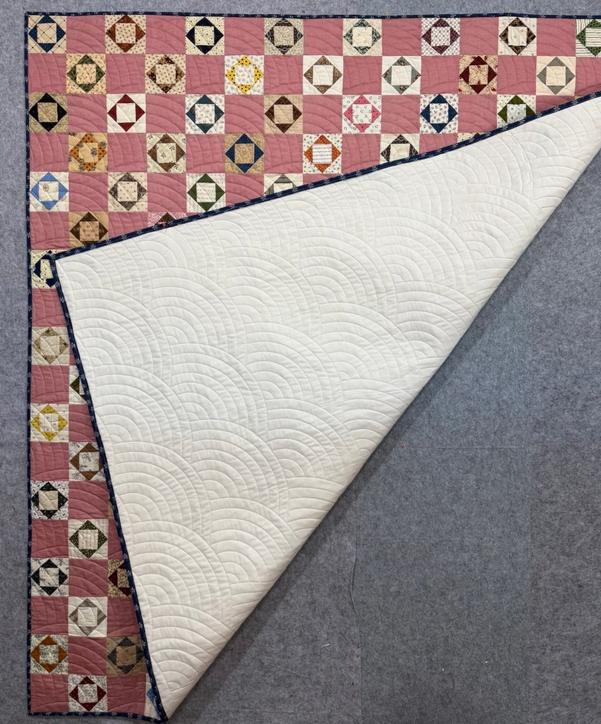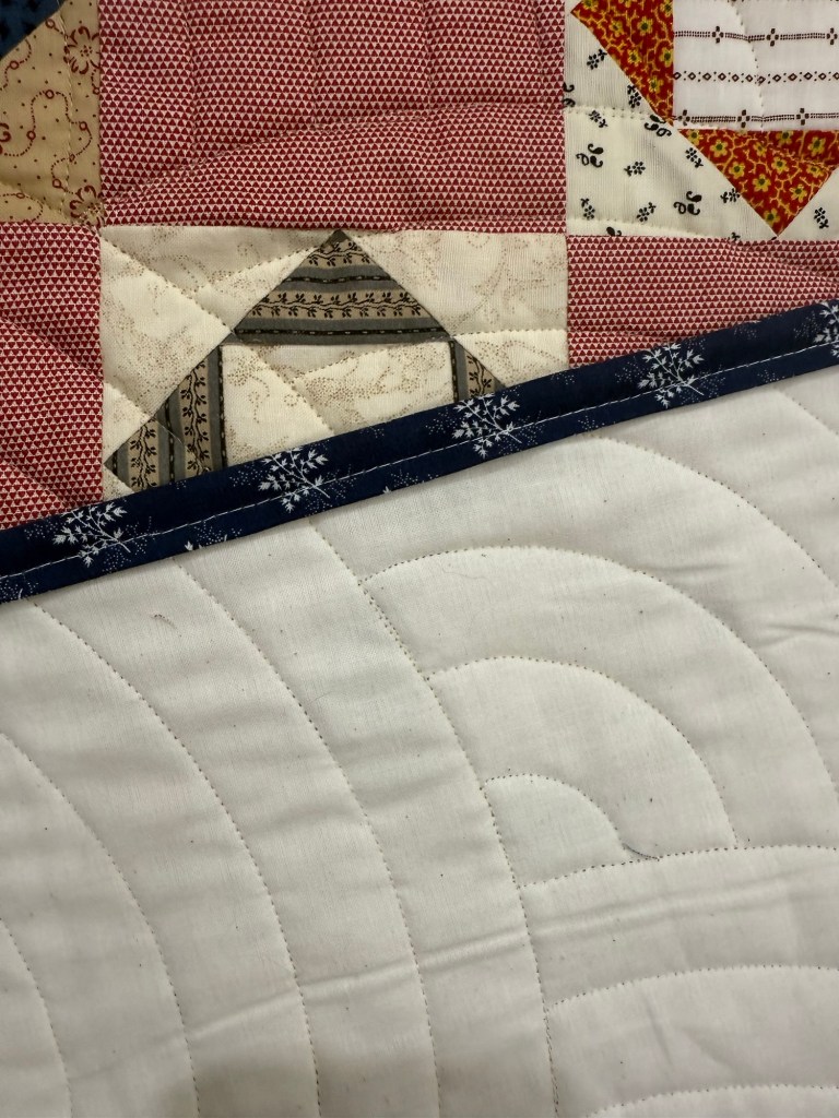 Congrats on your finish! Looks terrific, the Baptist Fan quilting is exactly the right motif for it. If you’re interested in machine binding, I have a tutorial I can send you. My method uses glue basting and produces a very clean professional finish. Send me your email address and I’ll send it to you. ochterbeckj at gmail dot com