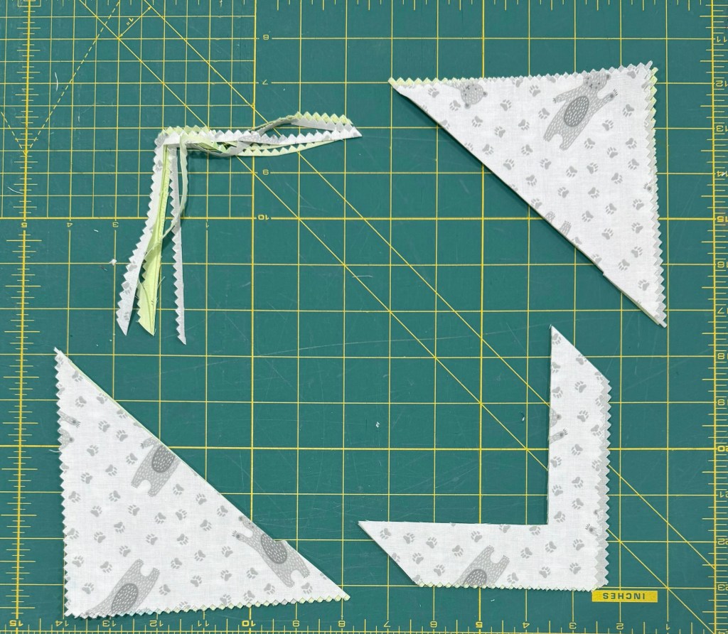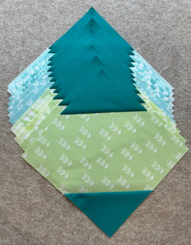 I have all my main pieces and a pile of large triangles leftover for a second project. Because they are all close to the same size and shape, I’ll store them together. I should have enough for 84 4 inch finished HSTs. That’s perfect for a baby quilt once I cut some background triangles to go with.