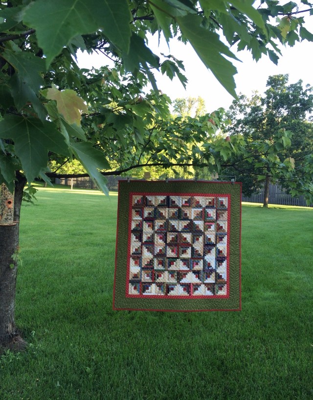 The blocks finish at 4 inches. I think I drafted the block in EQ but I don’t really remember anymore. The quilt finished at 42 inches square. And it really is square but the wind made it look like it wasn’t in these pics.
