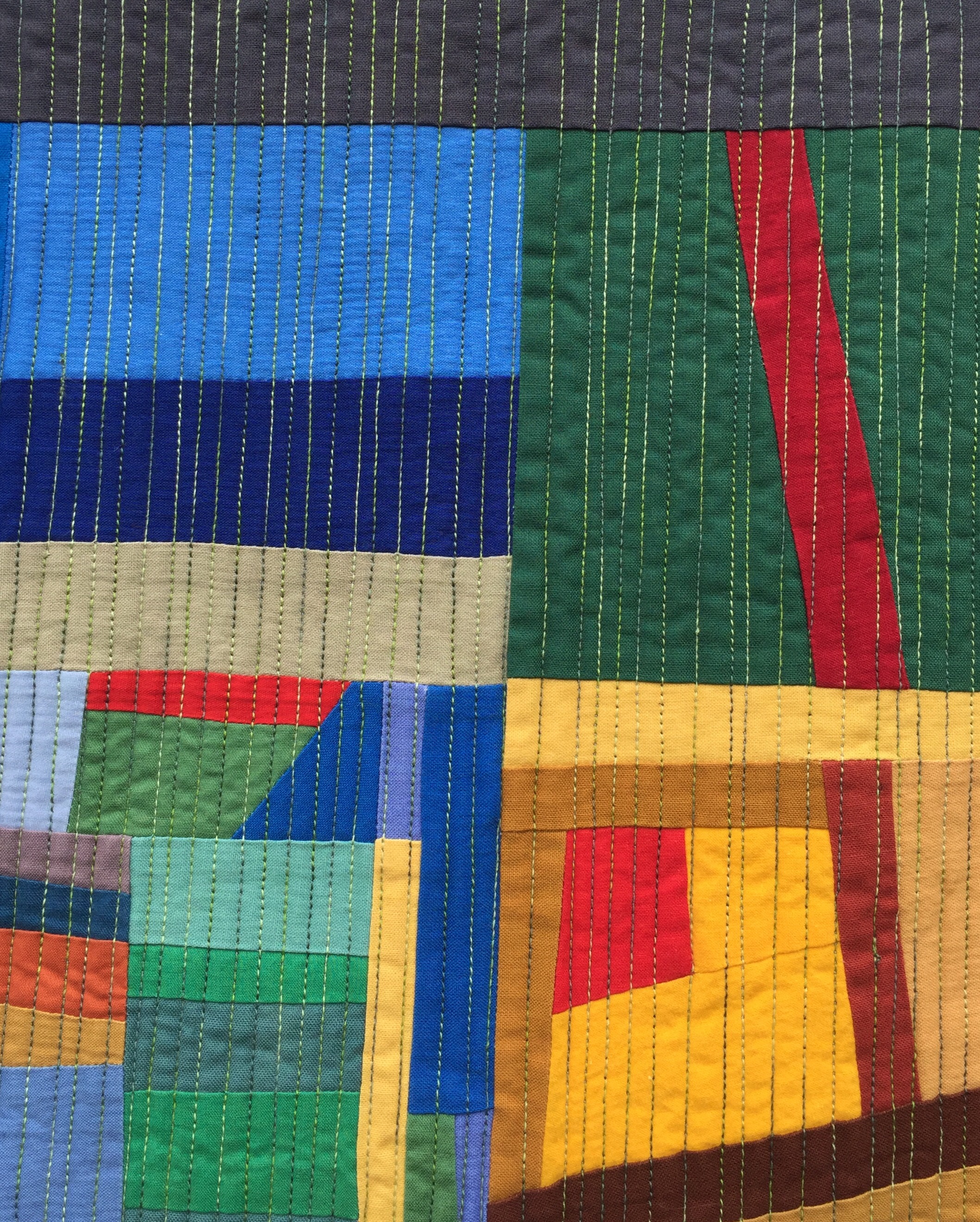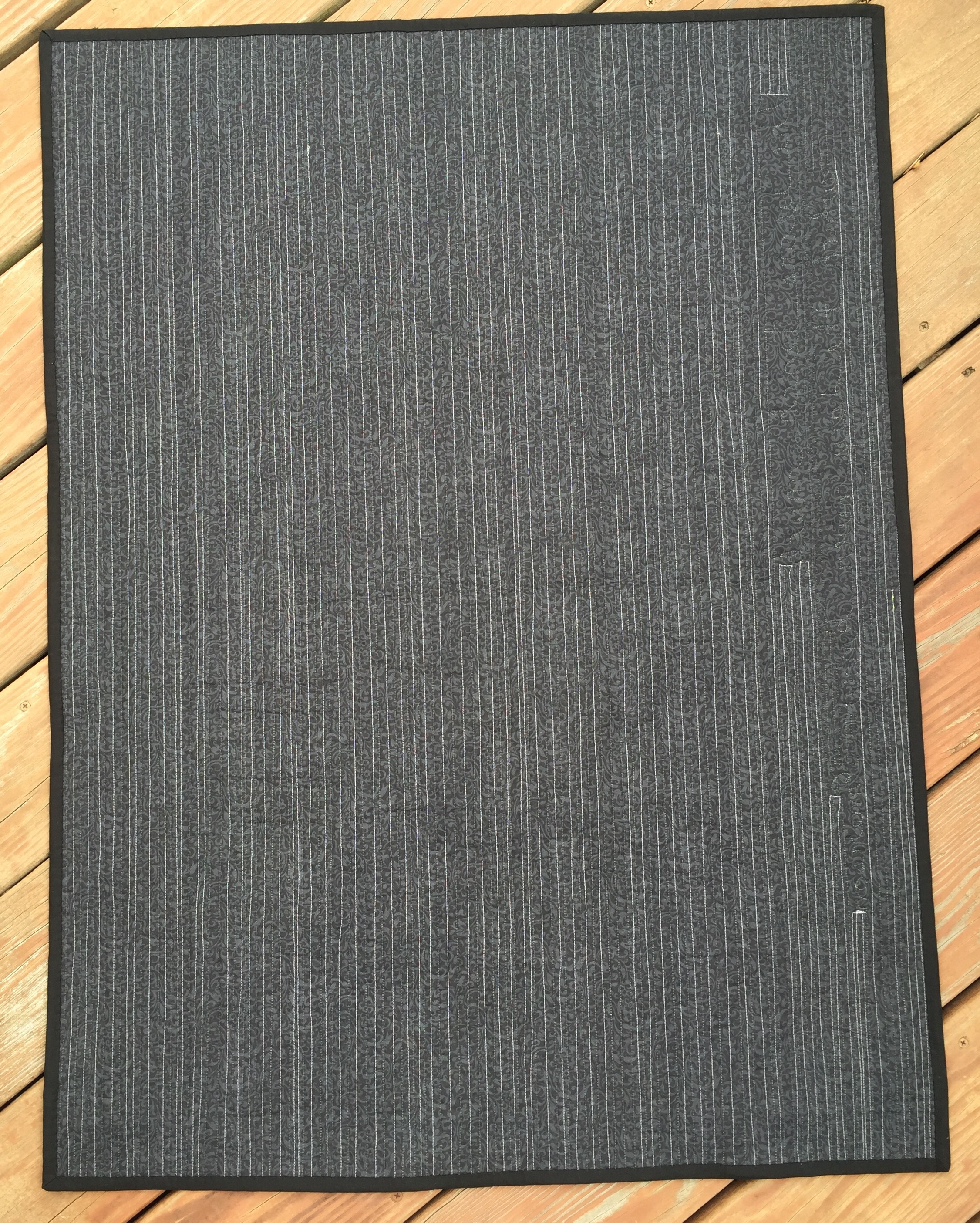 I used a variegated green thread to quilt this in approximately parallel lines about 1/4 inch apart. I used two different colors of gray thread in the bobbin.