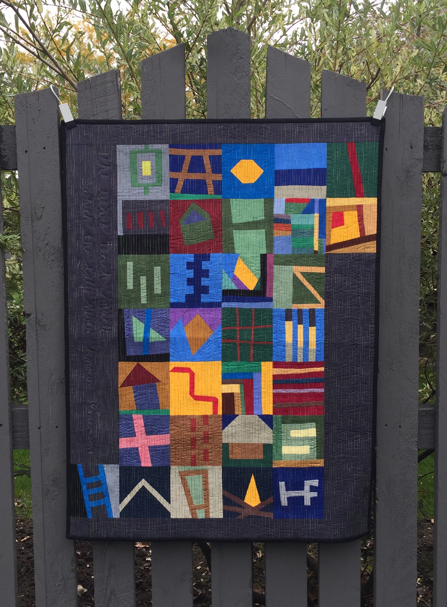 This UFO has been a long time in the finishing. I made these blocks as a block a day exercise back in May of 2010. I made up a few rules for myself. Each block would finish at 5 inches and I could only use solids. Each block should in some way represent that day. You can read more about this project here. Looking back now, I don’t even remember what some of these meant! Other memories are crystal clear. Like the day Daughter #1 returned from her study abroad trip to India, the day I received mail from Daughter #3 while serving in AmeriCorps, a camping trip, a day at the beach, an excursion to a favorite museum etc.