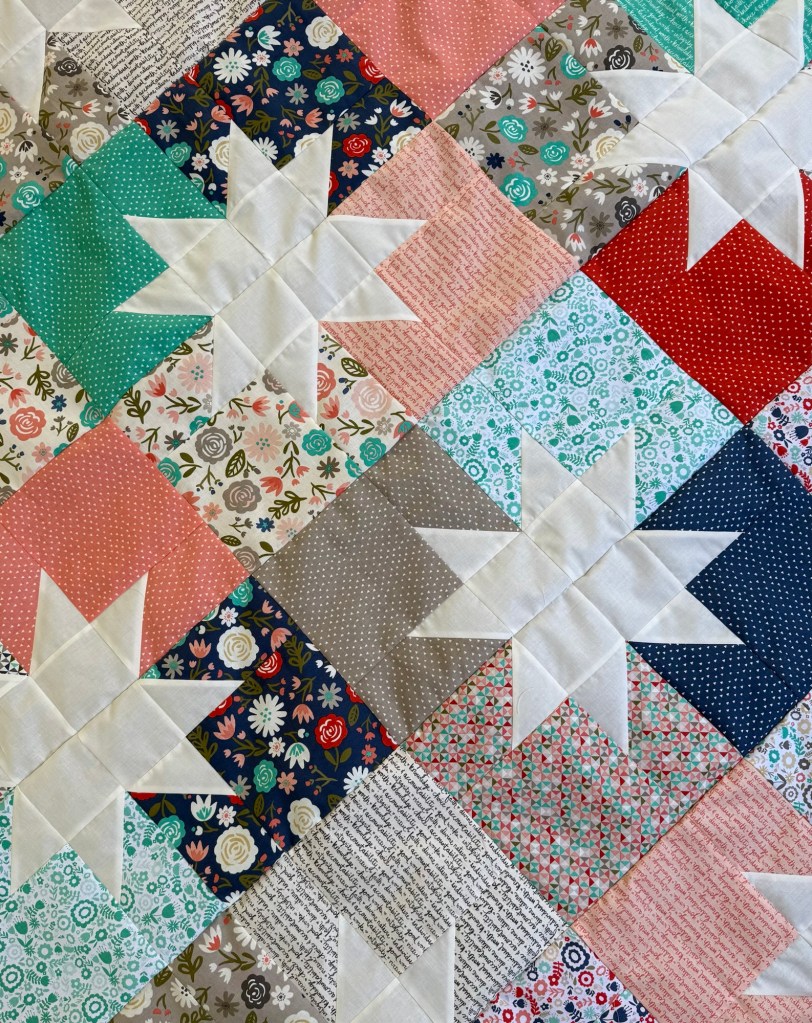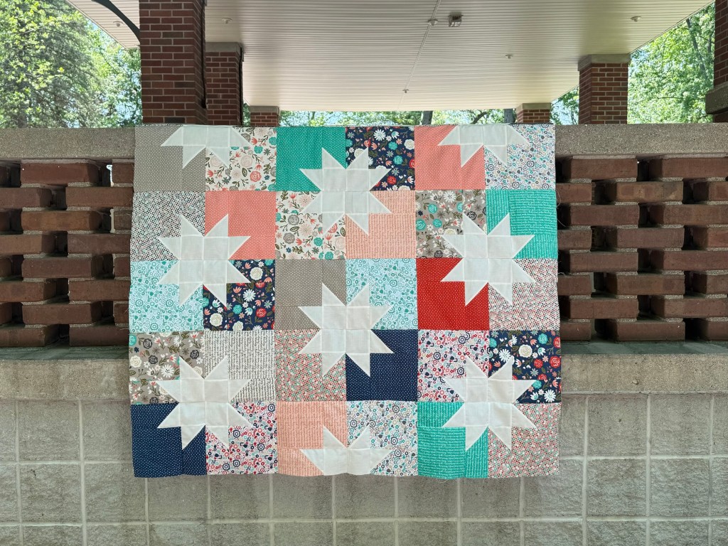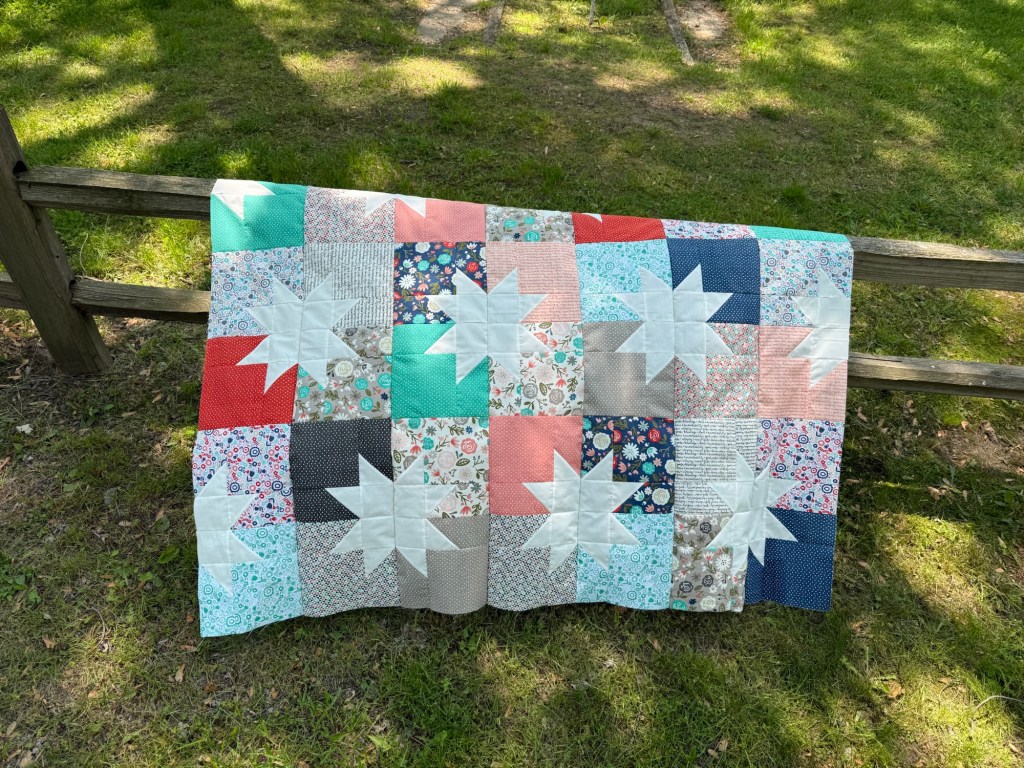My top is done. It is a great size for donating to project Linus. The pattern is called Star Pop and it is available from Emily Dennis.