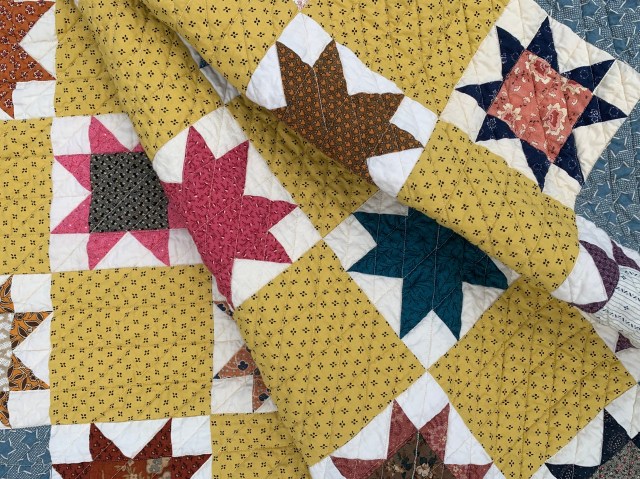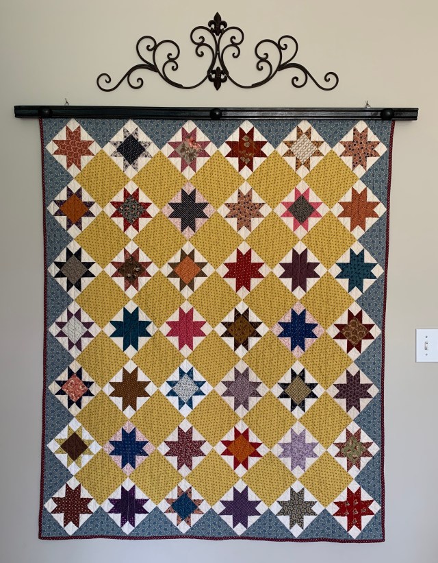And here it is hanging in my family room. The stars finish at 6 inches and the quilt finished at 50 by 60 inches.