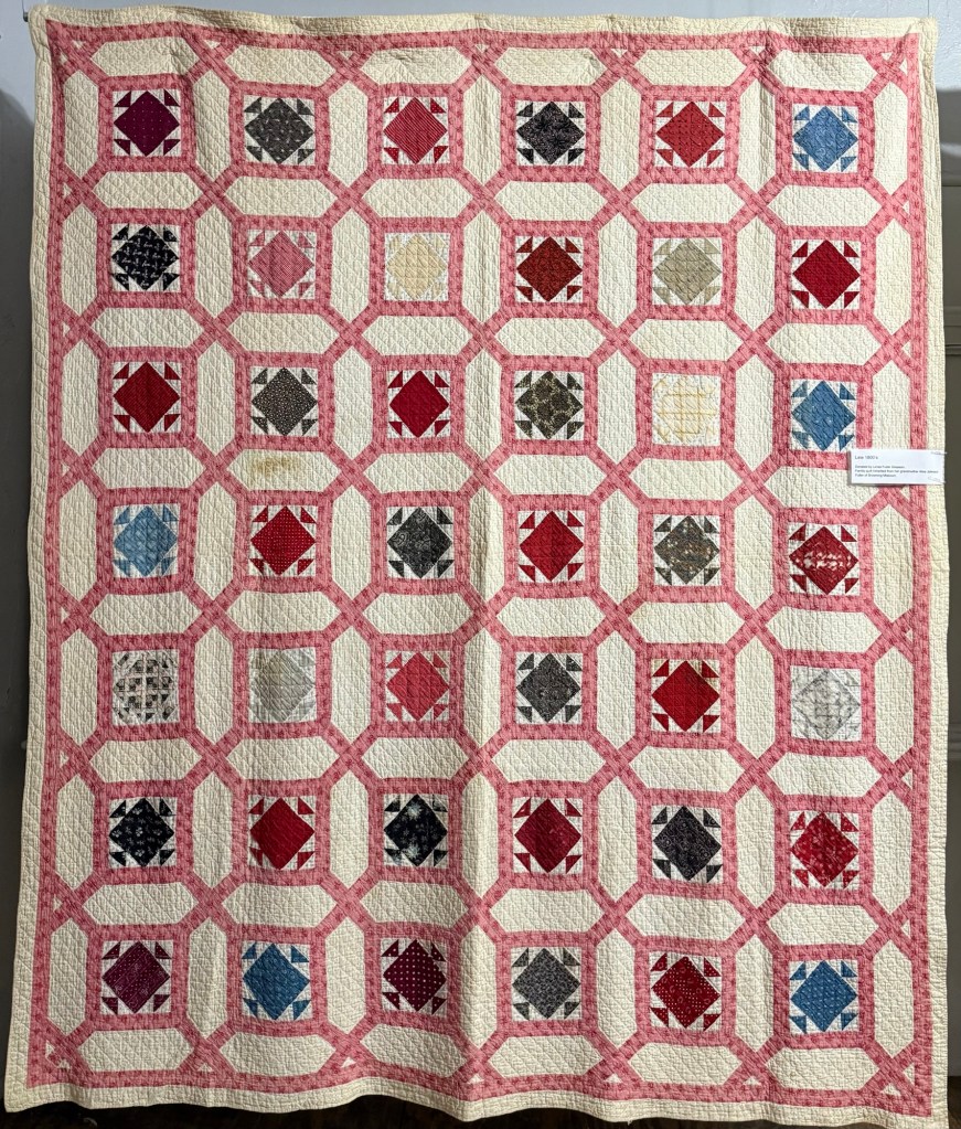 I am intrigued by the one with small blocks and pink/white “sashing.” Can’t quite figure out how she did that, but beautiful effect.