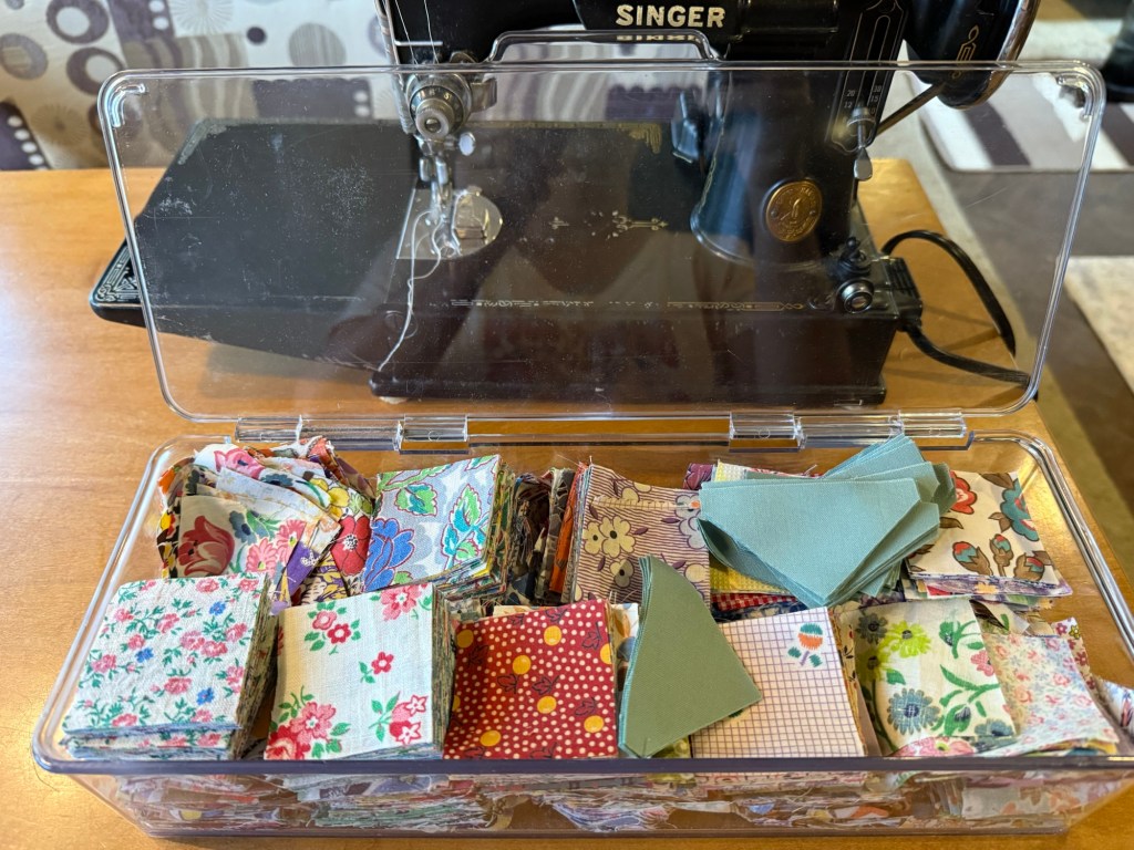 After the I Spy quilt, I was ready to work on something smaller. This bin holds vintage 2” cut squares.