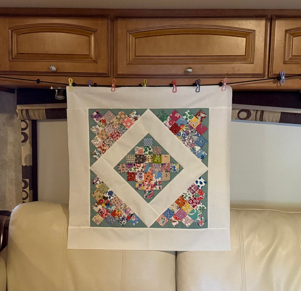 If you are wondering how I hung this in the RV, I used this elastic clothesline with integrated clips. I love this thing! Might buy another for the sewing room.