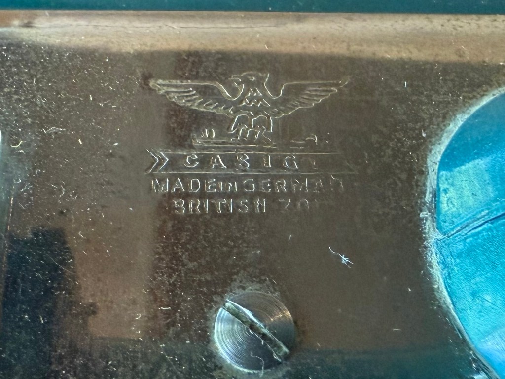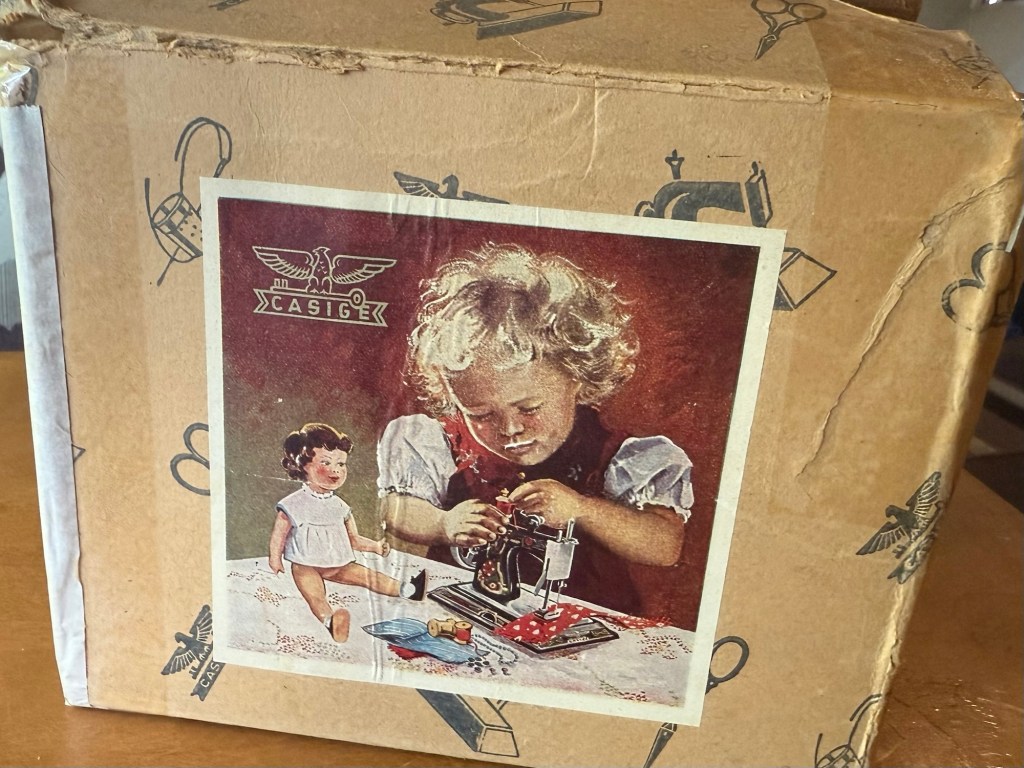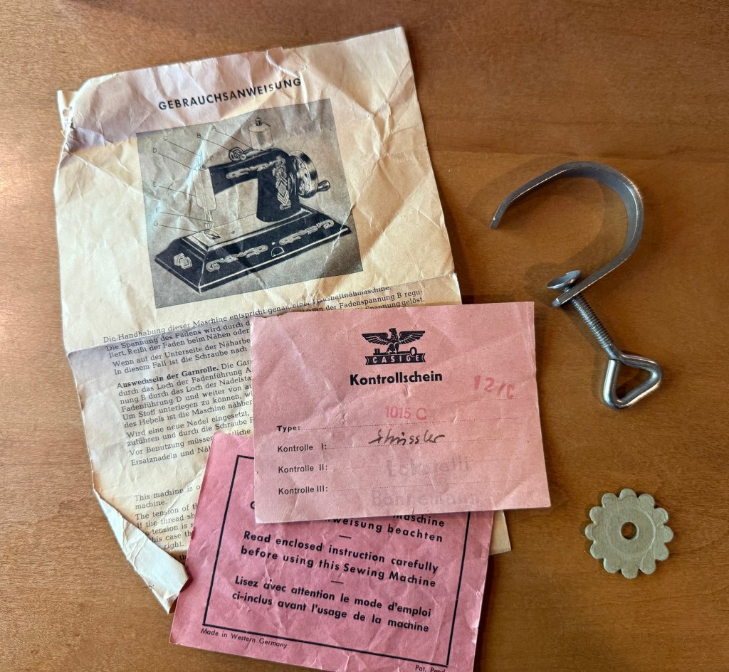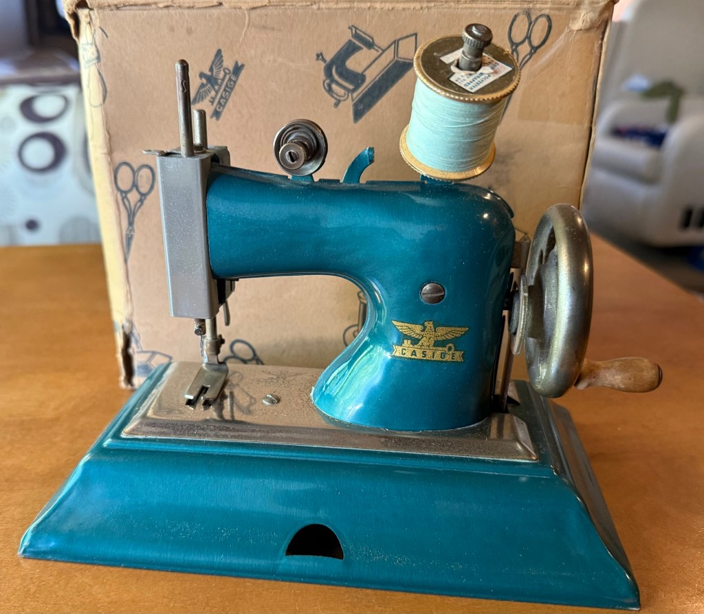 I just love this color! The spool pin is bent, but otherwise it is in very good condition.