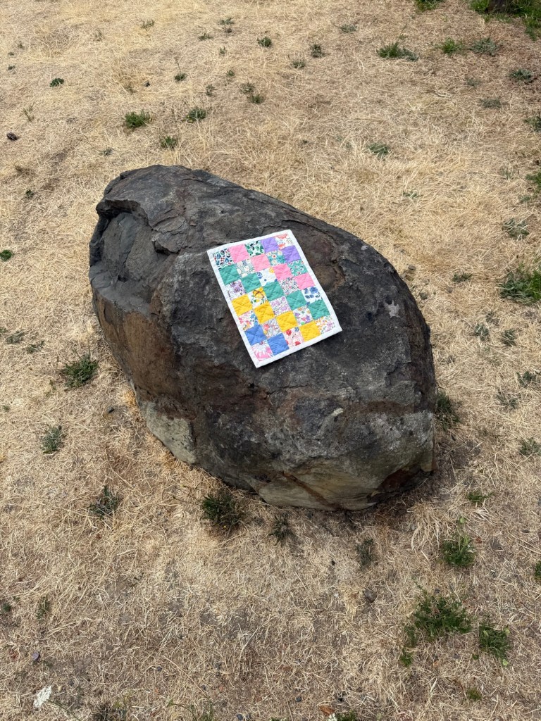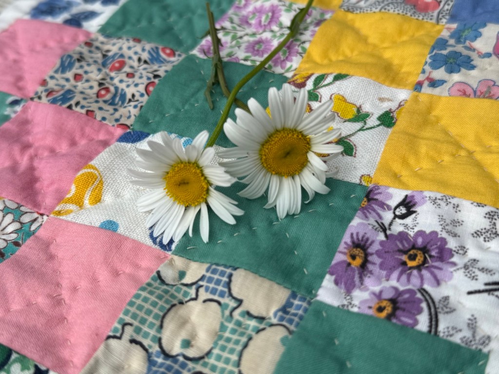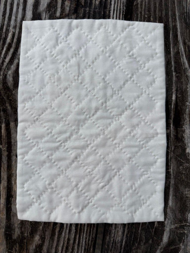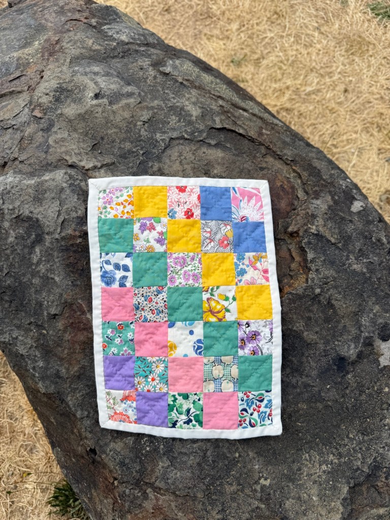 All fabrics are vintage except for the backing/binding. It finished at 8 by 11 inches.