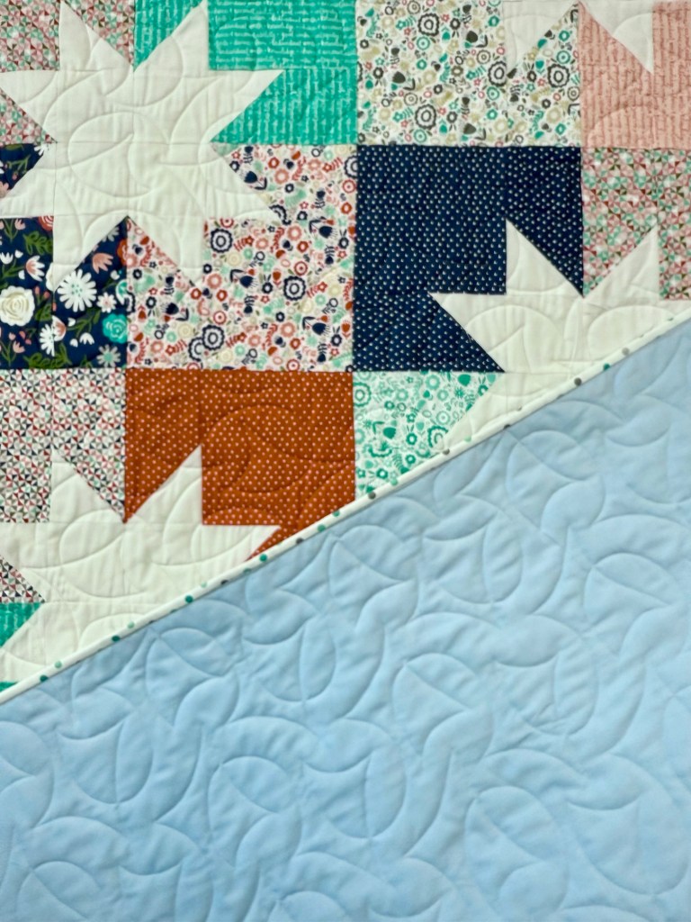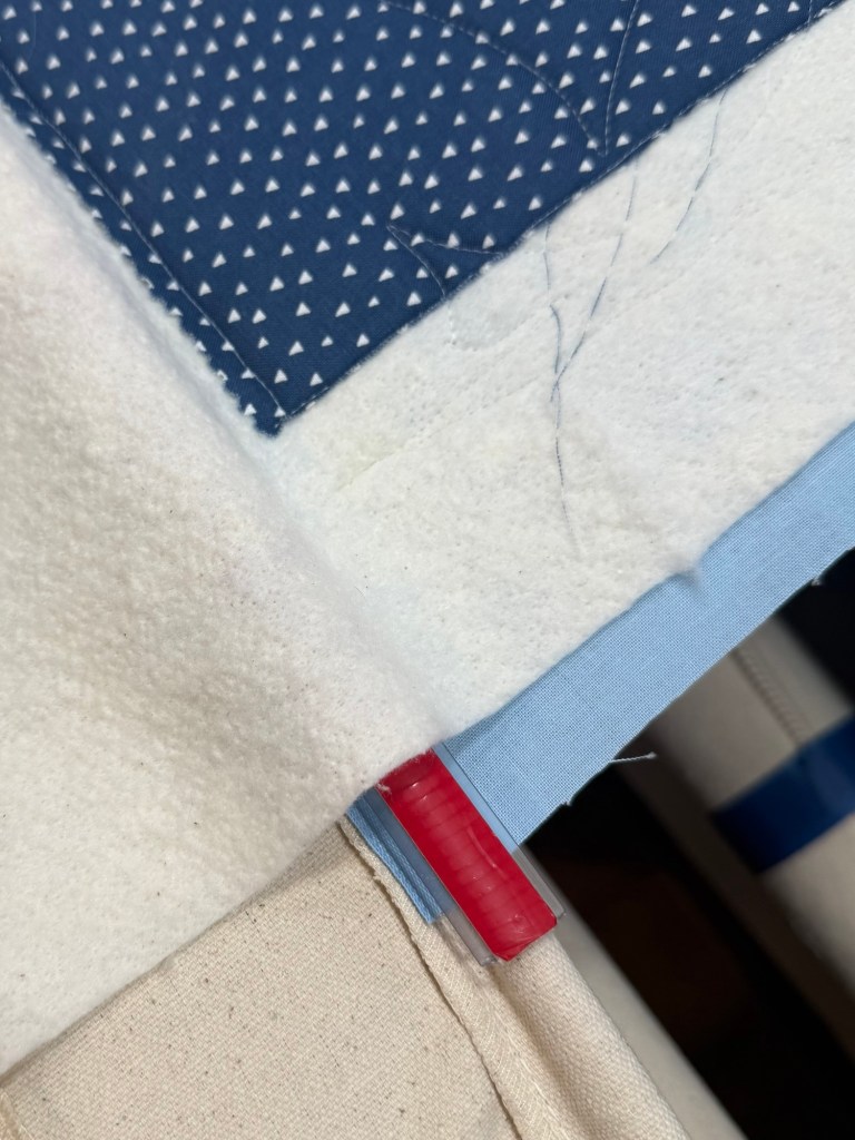 The binding is perfect! Looks like you had barely enough backing to squeak by, whew!! I accidentally loaded a backing sideways recently, causing the length to run short……unloading, adding a strip and reloading is frustrating :-(. I’ve taken to marking the top of my backings now, lol.