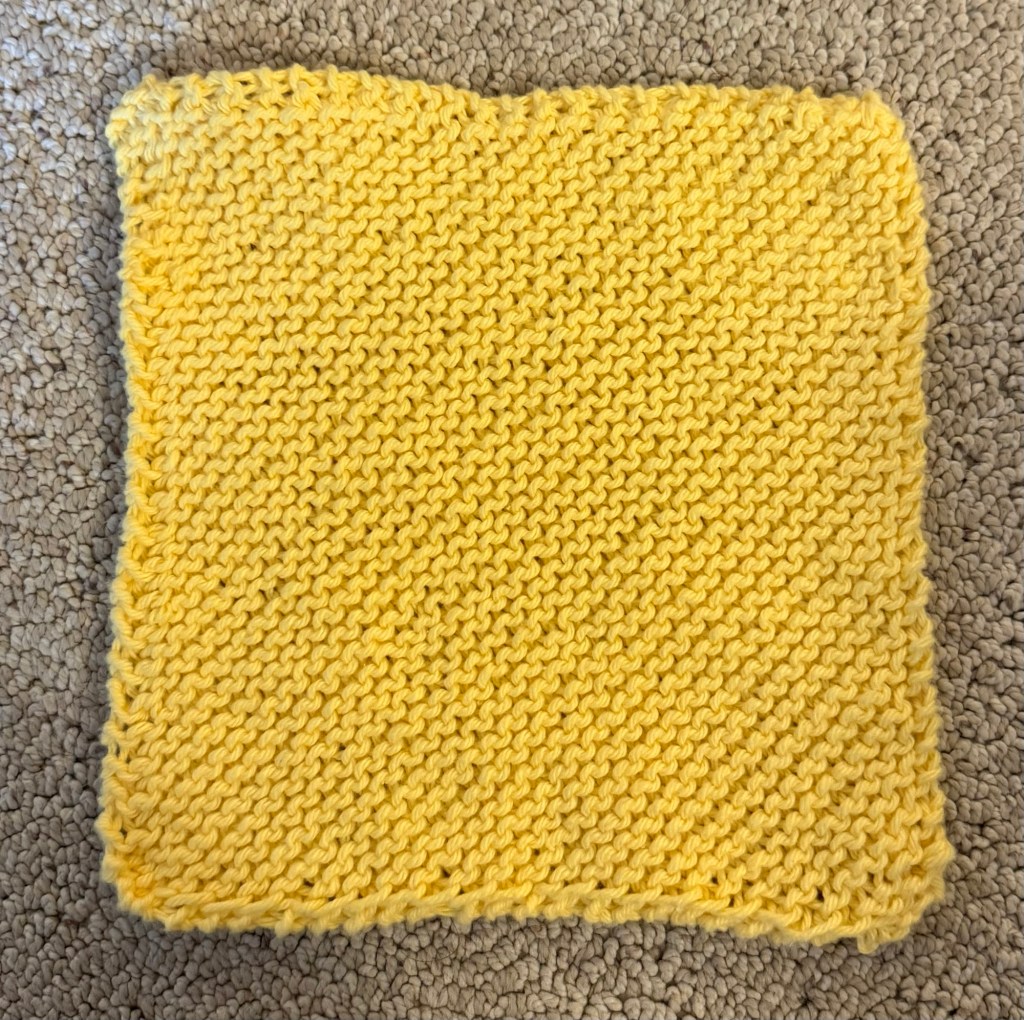 I use size 8 needles and cotton yarn. They look better after they’ve been washed. As you can see, I’m not a great knitter. This little “pattern” requires zero thought, so it’s good for working on while watching TV or chatting with friends.