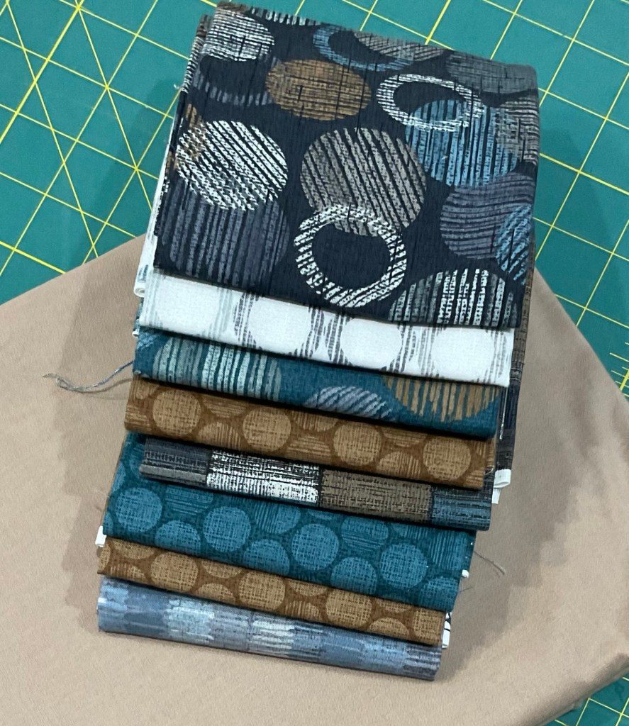 Scary, I know. 🤣 I figured out a plan for these fat quarters plus this background fabric. Before cutting, I did replace the white one and the bottom FQ.