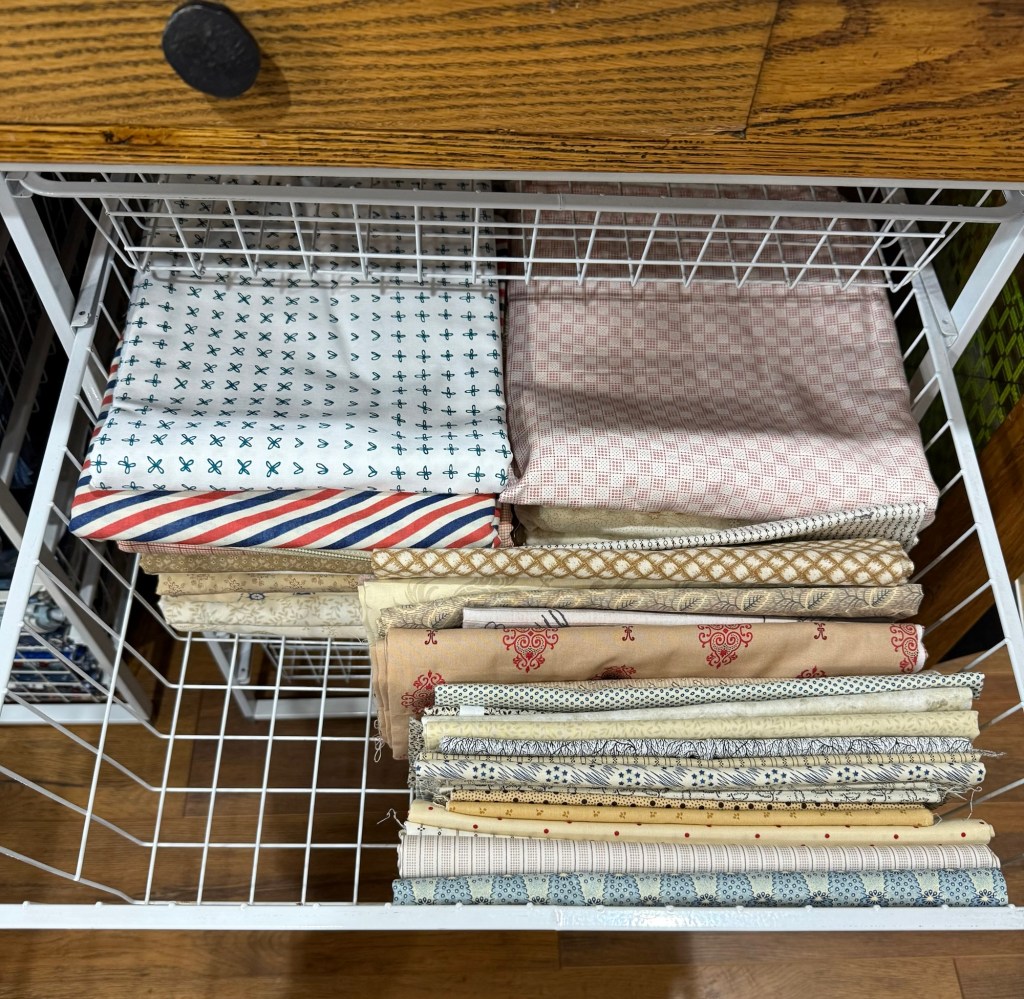 Someone asked about how I fold fabric. Larger pieces (more than a yard) are wrapped around my largest ruler and then folded in half. You can see piles like this at the back of the drawer below.