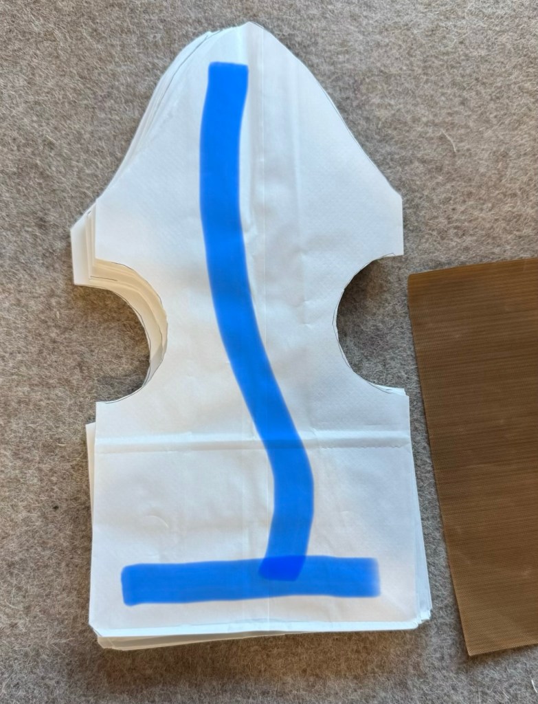 Excuse my sorry diagram here, the blue shows where I put hot glue to glue the bags together in a stack. after all nine are glued this way, put hot glue on the top bag and bring the first bag around to complete the circle..