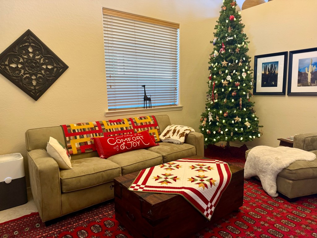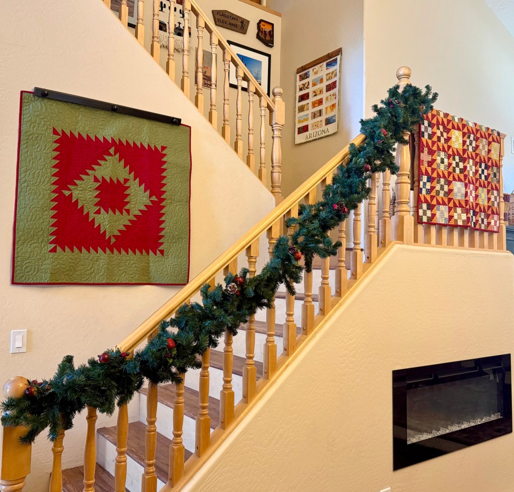 I made the green and red quilt several years ago. I intended it to be a Christmas quilt, but this is the first time I could actually find it at Christmas!