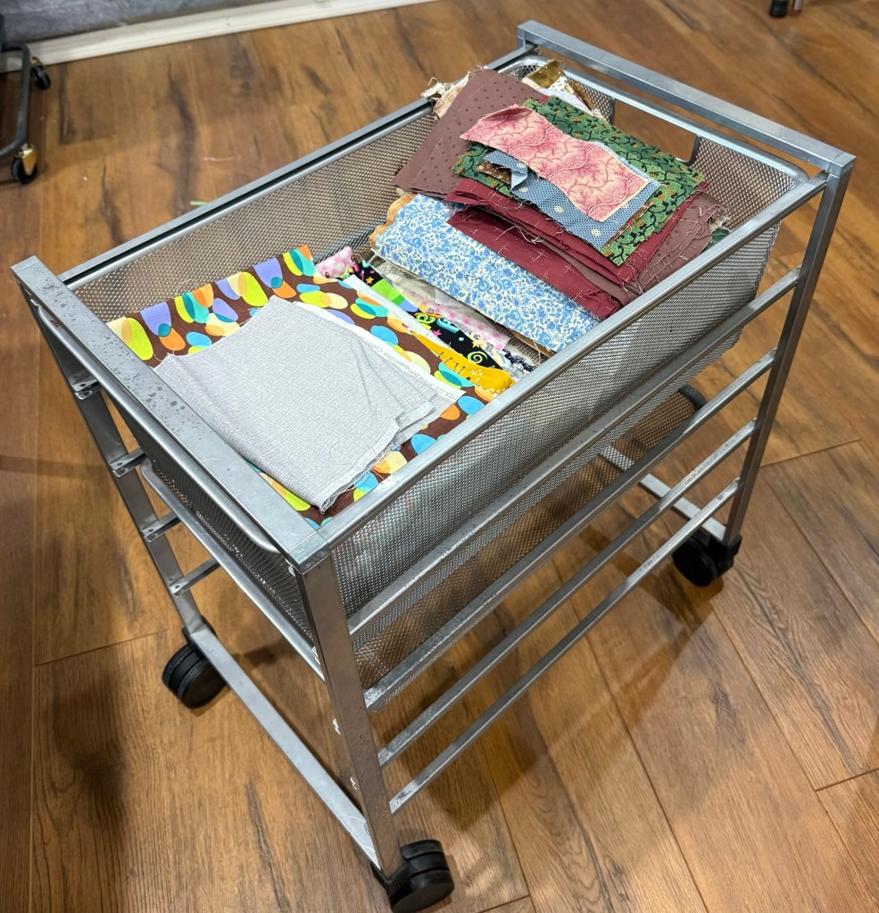 I generally think of my fabrics in two broad categories, brights/modern and repro/darks. The pile of scraps in the front of the cart are modern, the back is repro stuff. I haven’t started processing the repro stuff yet.