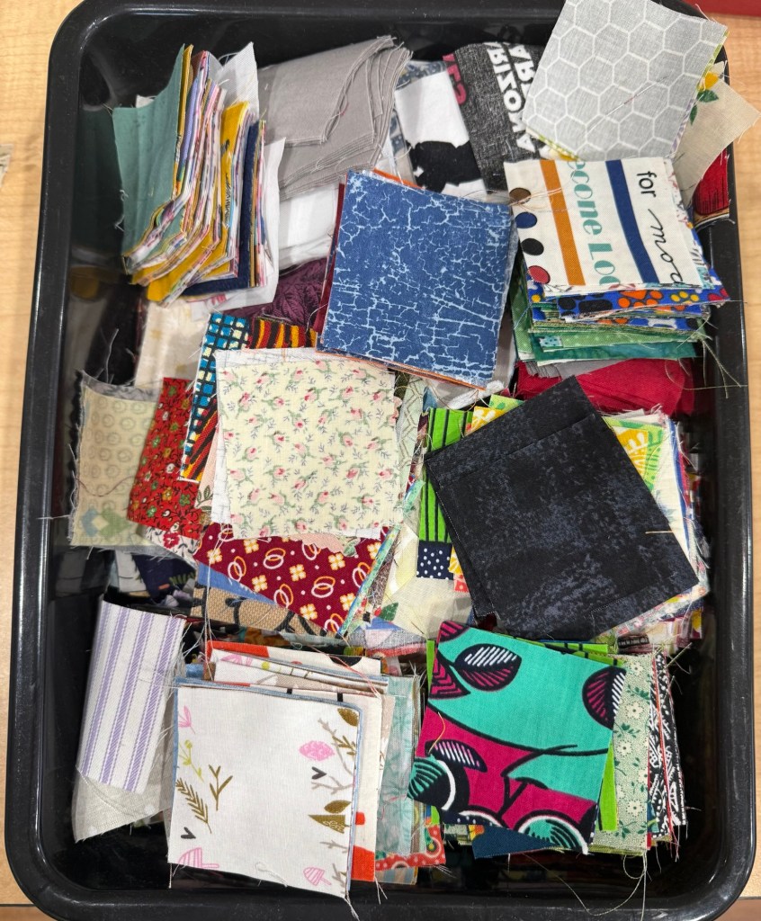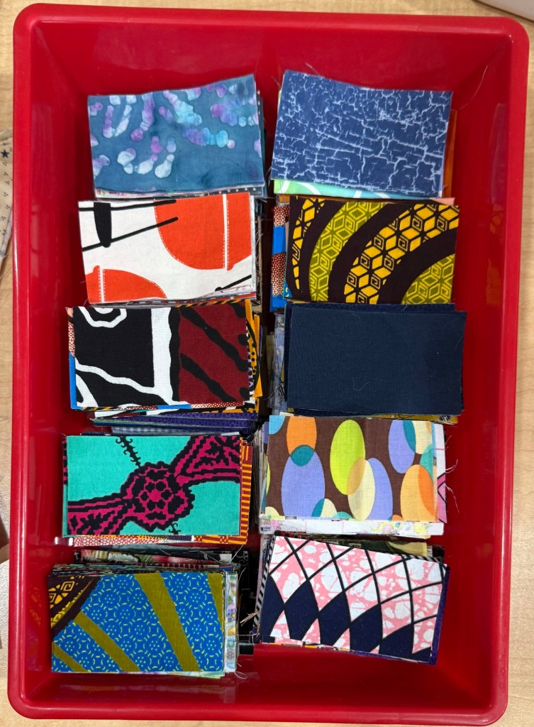 A lot of modern/bright scraps from the cart ended up in that bin. I plan to make another scrap quilt from rectangles eventually. I also added a bunch of 2 1/2” squares to this bin.