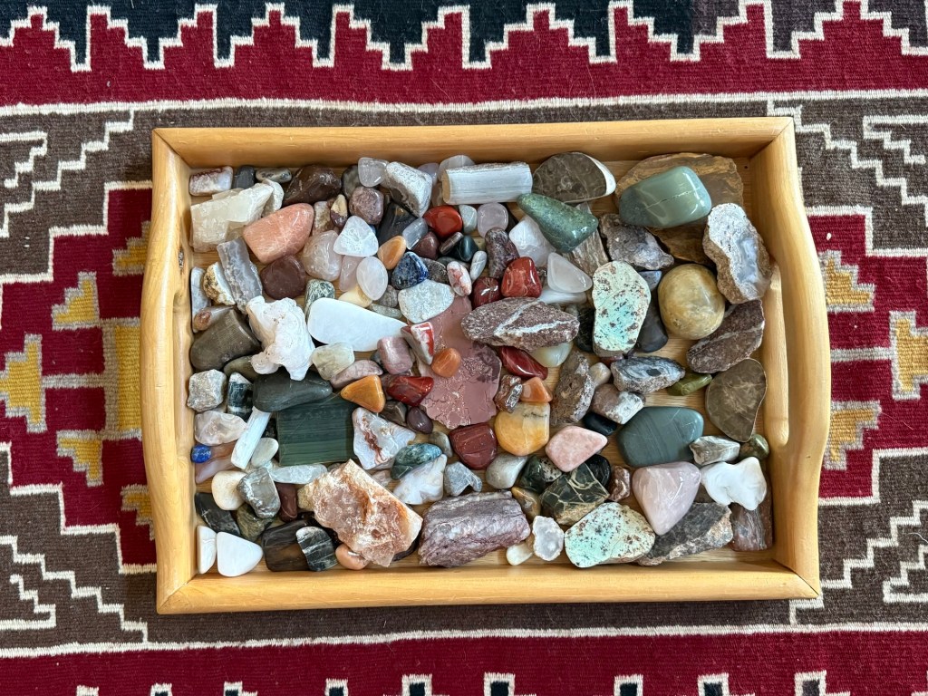 I’ve been asked what I do with my polished rocks. This tray was made by Daughter #2 and it sits on my coffee table.
